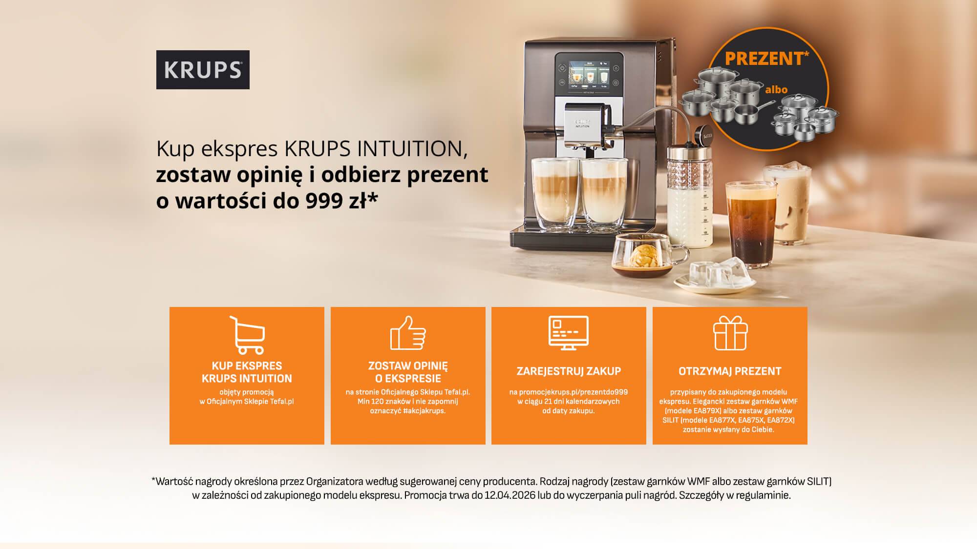 Kup wybrany model ekspresu KRUPS Intuition, zostaw opinię, wypełnij formularz i odbierz luksusowy zestaw garnków WMF Brilant (dla modeli Hot&Cold) lub Silit Achat.