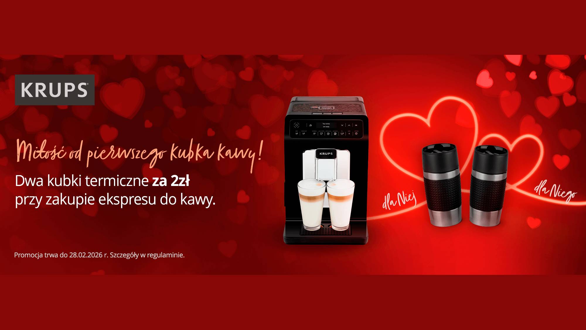Kup wybrany ekspres KRUPS objęty akcją promocyjną i odbierz 2 kubki termiczne za 2 zł - specjalnie na Walentynki 2026.