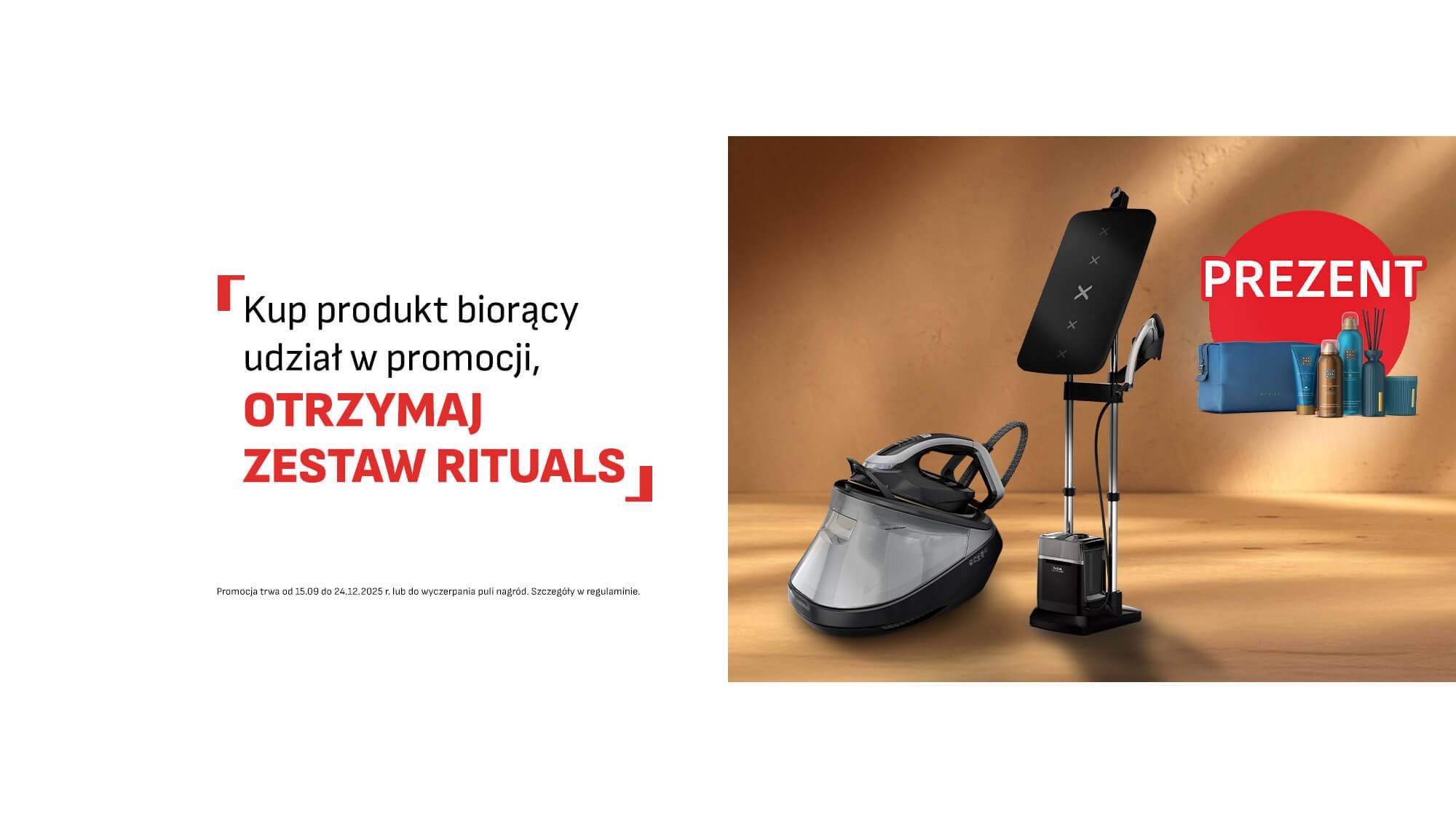 W okresie trwania promocji kup wybrany model generatora pary Tefal lub stację do prasowania IXEO, zarejestruj swój zakup w formularzu (link poniżej) i odbierz zestaw kosmetyków Rituals o wartości 235 złotych.