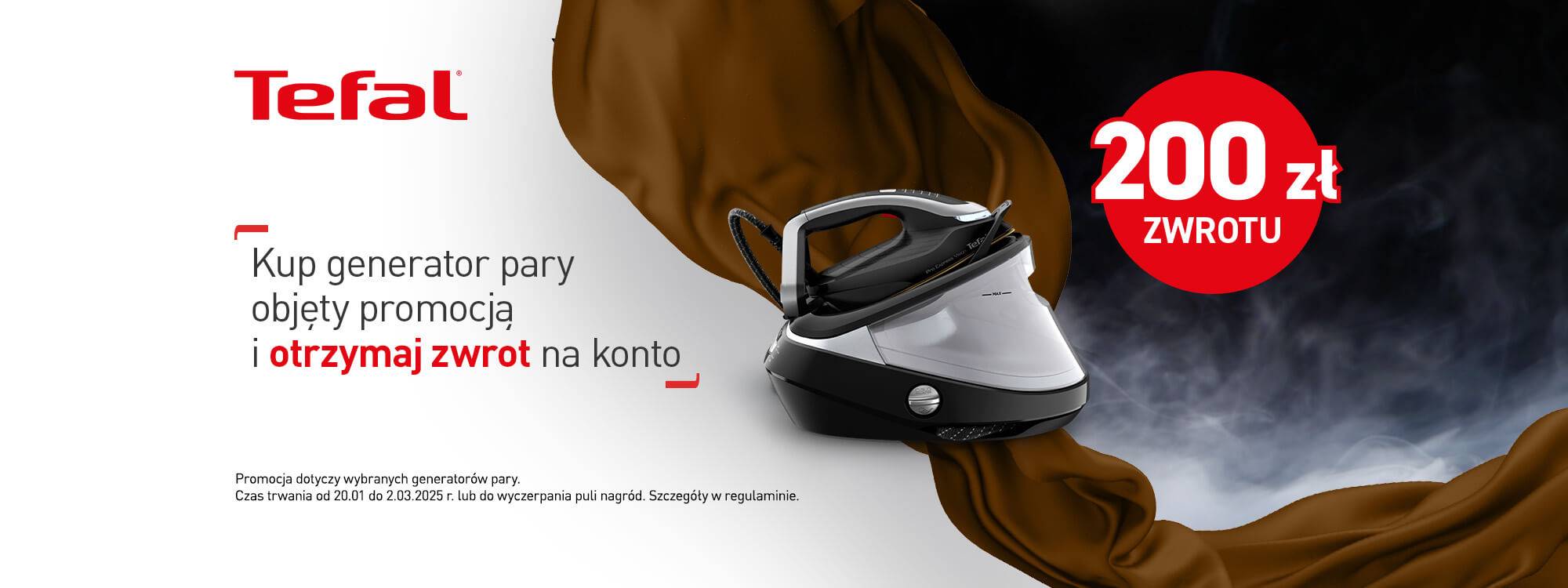 Kup wybrany model generatora pary Tefal w okresie 20.01.2025-2.03.2025 za pośrednictwem oficjalnego Sklepu Tefal, zarejestruj swój zakup na stronie https://www.tefal.pl/prasowaniezwrottefal i odbierz 200 złotych zwrotu na konto za swój zakup!