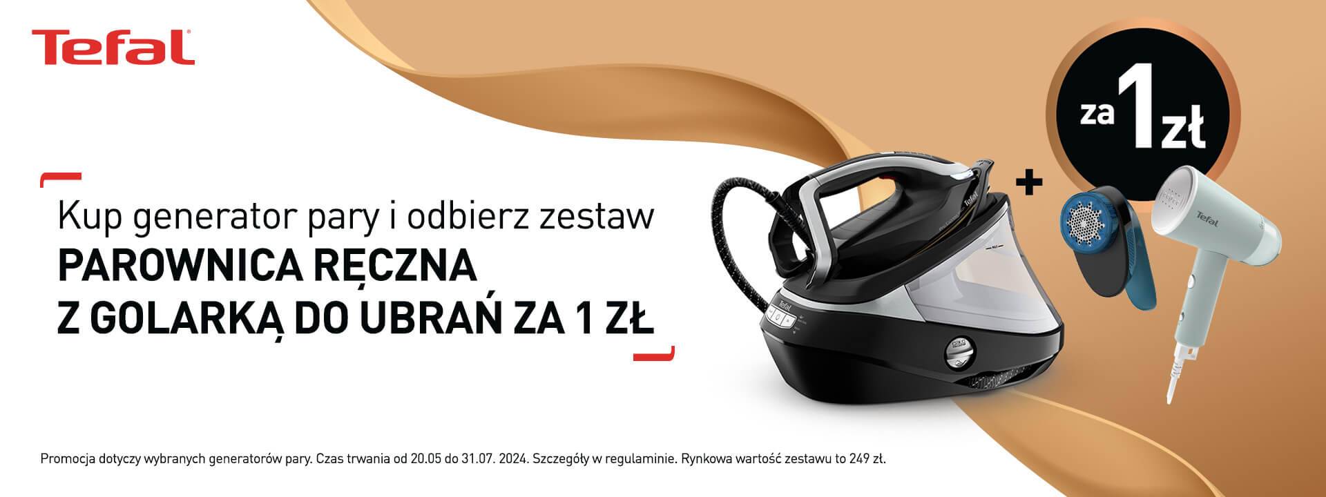 W dniach 20.05.2024-31.07.2024 kup wybrany model generatora pary Tefal (modele objęte promocją znajdziesz poniżej) i odbierz aż dwa prezenty za 1zł!