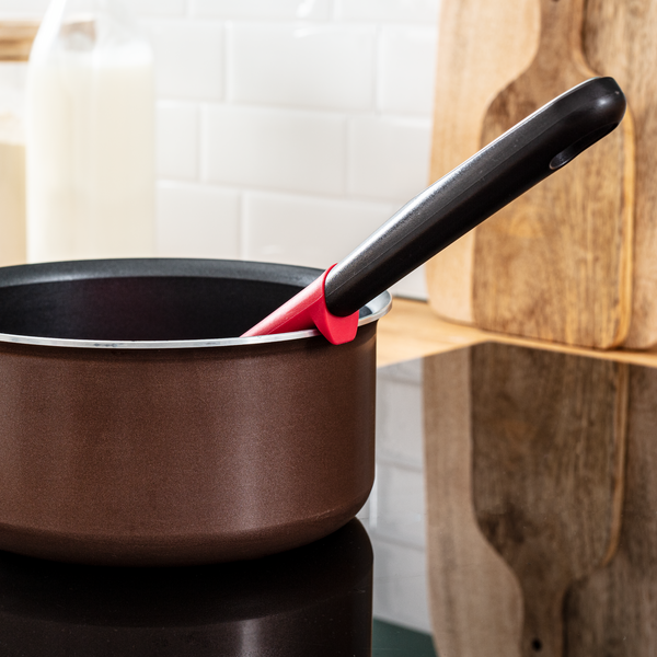 - Silikonowy pierścień: Uniemożliwia wpadnięcie łyżki do garnka oraz chroni uchwyt przed rozgrzanymi krawędziami garnków i patelni