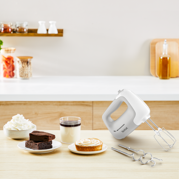 Tefal Prep'Mix to mikser, który z łatwością dotrzymuje kroku Twoim kulinarnym pomysłom – od lekkich kremów po gęste ciasta. Z mocą 450 W i metalowymi końcówkami do ubijania i zagniatania, pozwala działać szybko i skutecznie. Ergonomiczny kształt i intuicyjna obsługa sprawiają, że praca z nim to czysta przyjemność. Z Tefal pieczenie staje się proste, a efekty zawsze pyszne.