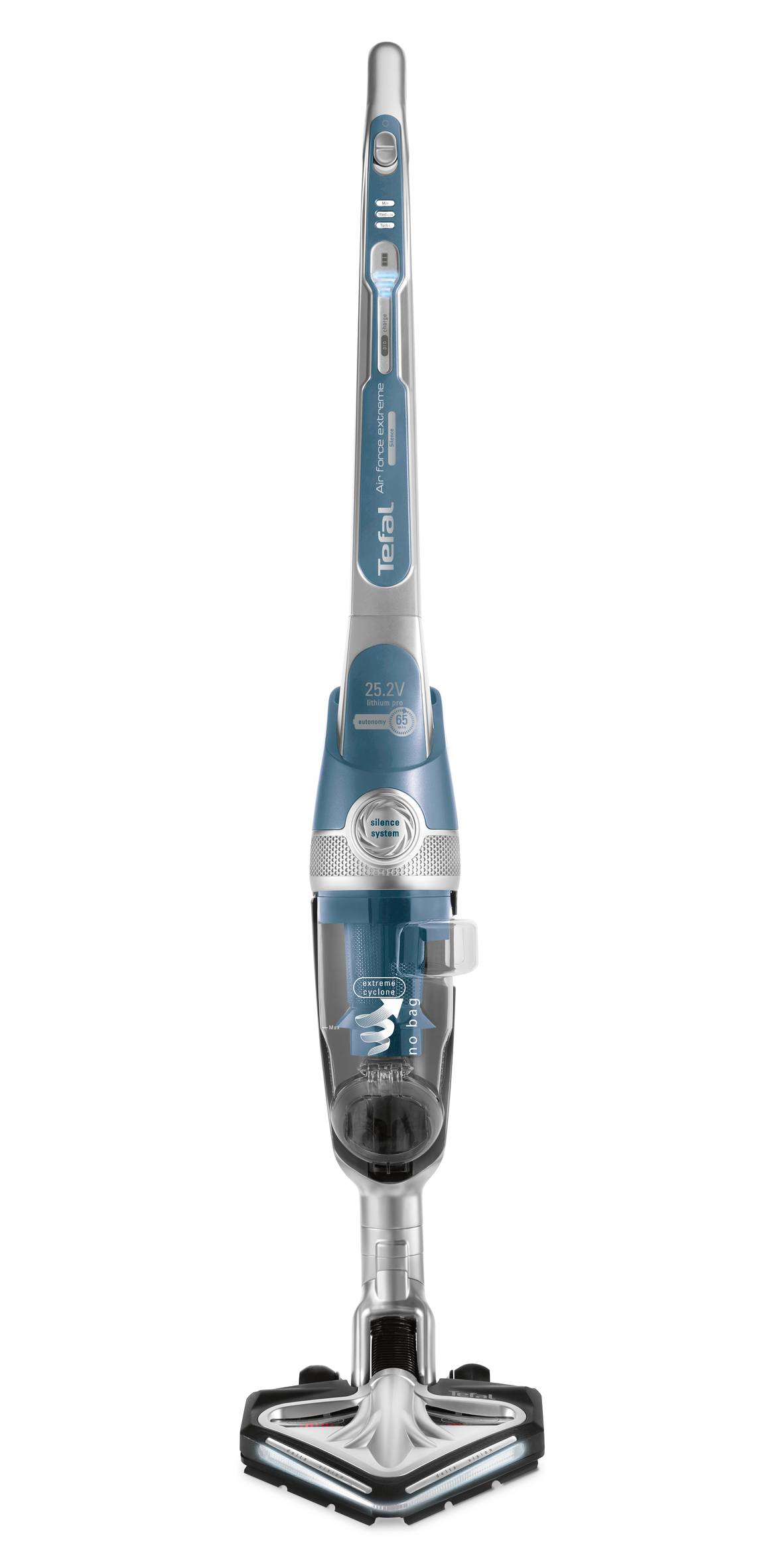 Air Force™ Extreme Silence zapewnia wyjątkową skuteczność i cichą pracę przy zachowaniu wygody charakterystycznej dla odkurzacza bezprzewodowego. Głowica DELTA ze szczotką o dużej prędkości (do 6200 obr/min) w połączeniu z zaawansowaną technologią Silence gwarantują dokładne odkurzanie przy emisji dźwięku na poziomie zwykłej rozmowy. Ultra-smukła głowica DELTA została zaprojektowana tak, aby docierać do każdego zakamarka, a podświetlenie LED zapewnia lepszą widoczność w trudno dostępnych miejscach. Technologia cykloniczna Air Force daje wysoki poziom separacji powietrza i kurzu. Łącząc najnowocześniejsze funkcje z pracą wydajnej baterii litowo-jonowej, bezprzewodowy odkurzacz Air Force™ Extreme Silence oferuje bezkompromisową skuteczność odkurzania przy niskim poziomie hałasu.
