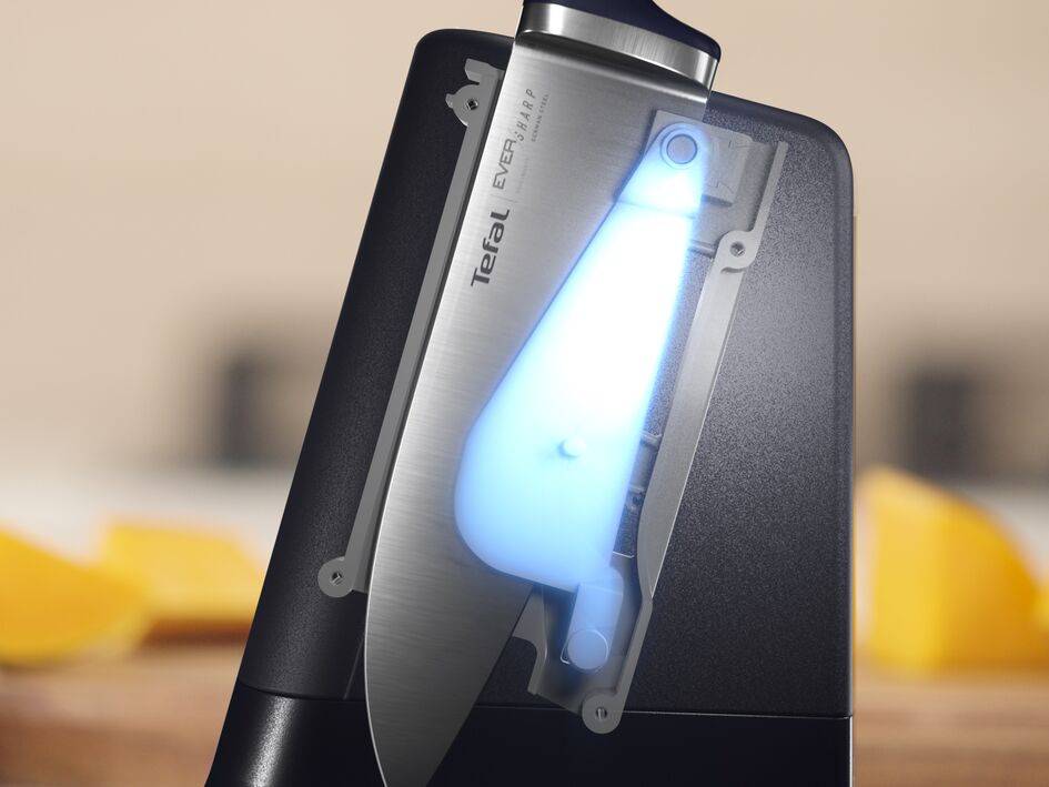 Ukryta w bloku technologia Tefal EverSharp jest opatentowana. Jak to działa? Po użyciu wystarczy wsunąć nóż do bloku. Znowu będzie naostrzony, pod odpowiednim kątem, z systemem prowadzenia Double-V. Twoje ostrze jest idealnie naostrzone od czubka aż po rękojeść dzięki obrotowym prętom ceramicznym - z optymalnym i stałym naciskiem zapewniającym długotrwałą ostrość.
