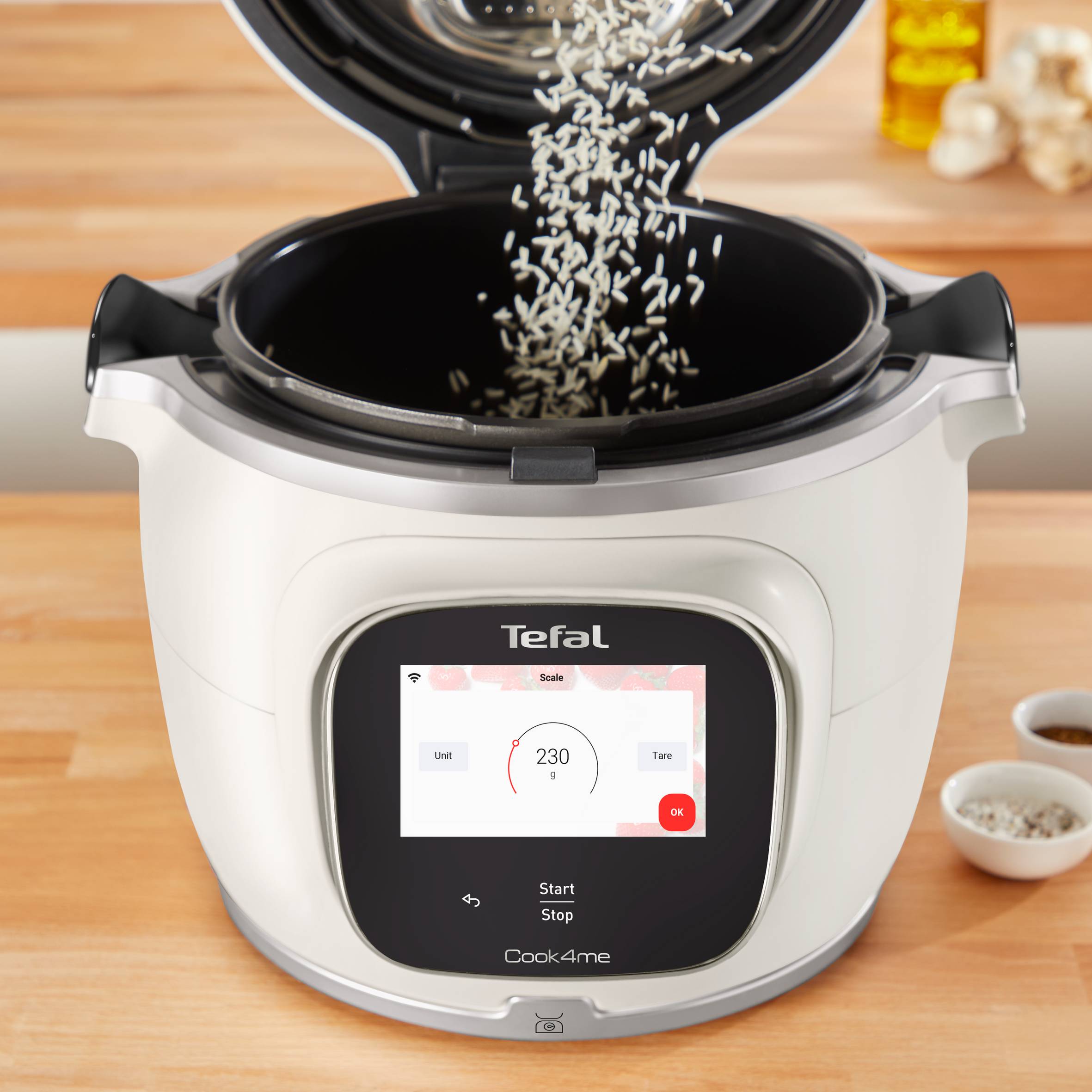 Odkryj Cook4me Touch Pro, multicooker, który ułatwia gotowanie! Ważenie składników za pomocą wbudowanej wagi. Korzystaj ze spersonalizowanych przepisów za pośrednictwem Wi-Fi i aplikacji My Tefal. Postępuj krok po kroku ze zdjęciami i filmami na ekranie dotykowym. Tryb szybkowaru pozwala zaoszczędzić czas lub wybrać jedno z 16 ustawień, w tym smażenie beztłuszczowe, aby danie potrawa była chrupiąca.