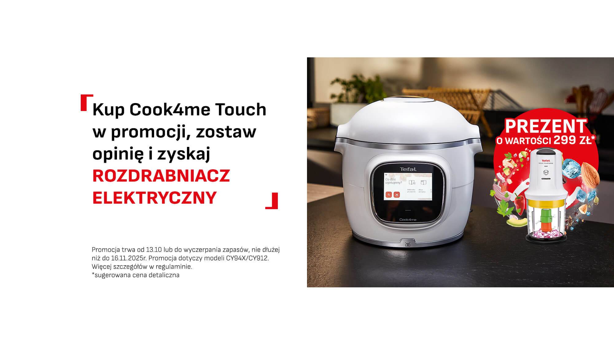 W okresie trwania promocji kup wybrany model inteligentnego multicookera Tefal Cook4Me, zostaw opinię o produkcie i wypełnij formularz promocyjny TUTAJ, aby otrzymać wyjątkowy prezent - elektryczny rozdrabniacz o wartości 299 złotych.