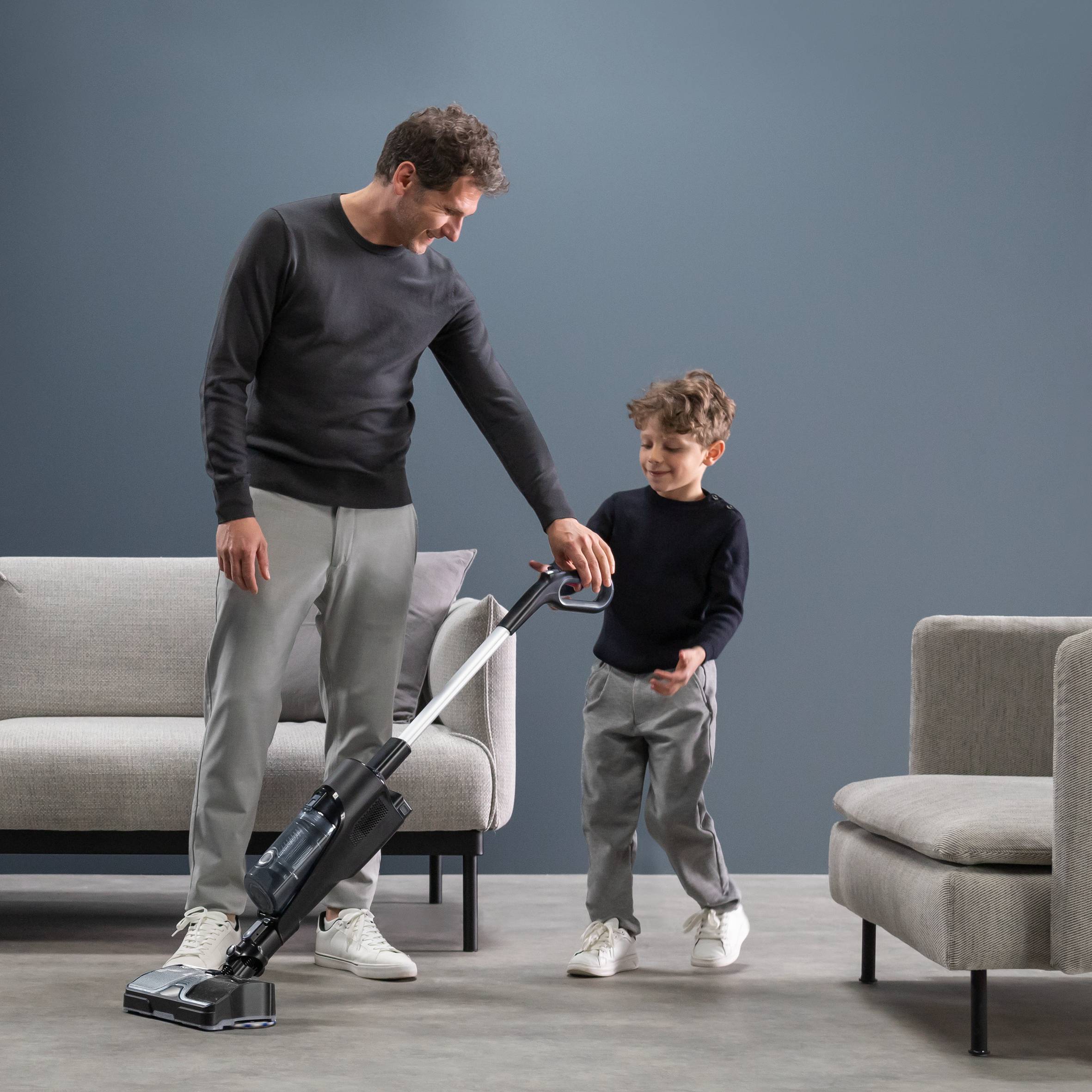 6-komorowa bateria 21,6 V gwarantuje 60 minut* bezprzewodowej pracy dla dokładnego mopowania bez pośpiechu. Czas pracy urządzenia w trybie standard podczas jednoczesnego odkurzania i mopowania to 20 minut.