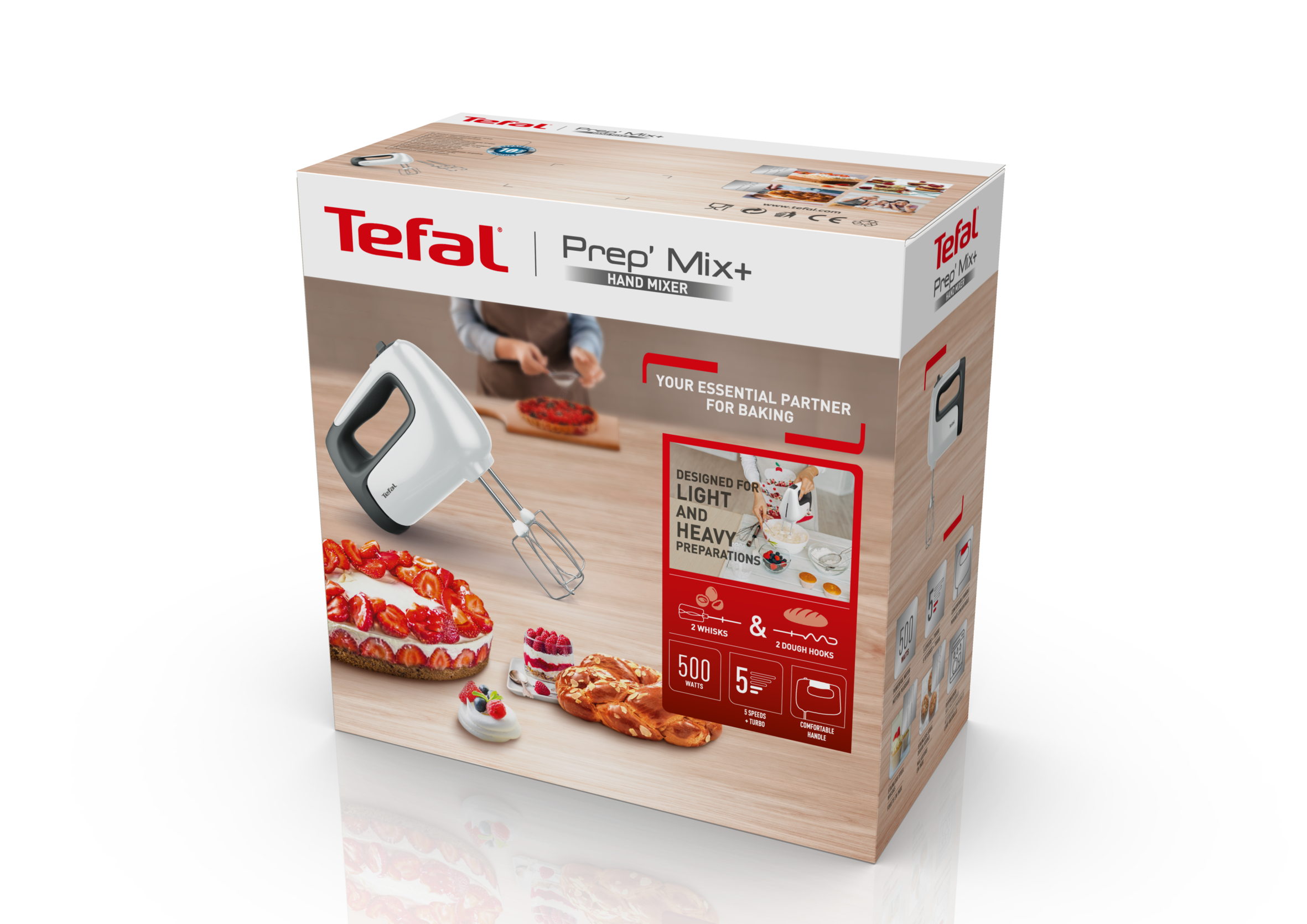 Zapach domowych wypieków i zadowolenie rodziny i przyjaciół to największa przyjemność. Dlatego Tefal przygotował dla Ciebie niezbędnego partnera do pieczenia! Odkryj mikser ręczny Tefal Prep'Mix+, który dzięki mocy silnika o wysokości 500 W poradzi sobie z większymi i mniejszymi kuchennymi zadaniami. Dołączone trzepaczki ze stali nierdzewnej idealnie ubiją białka jaj i śmietanę, a mieszadła ze stali nierdzewnej wyrobią ciasto i ubiją masło. 5 prędkości i tryb Turbo sprawiają, że przygotowywanie domowych wypieków jest naprawdę proste. Urządzenie zostało zaprojektowane tak, by jego wygląd odzwierciedlał wysoką wydajność. Ergonomiczna rączka jest pokryta antypoślizgową powłoką poprawiającą chwyt, a stabilna konstrukcja sprawia, że korzystając z miksera możesz odstawić go na bok, nie brudząc przy tym blatu. Mieszadła i trzepaczki nadają się do mycia w zmywarce.