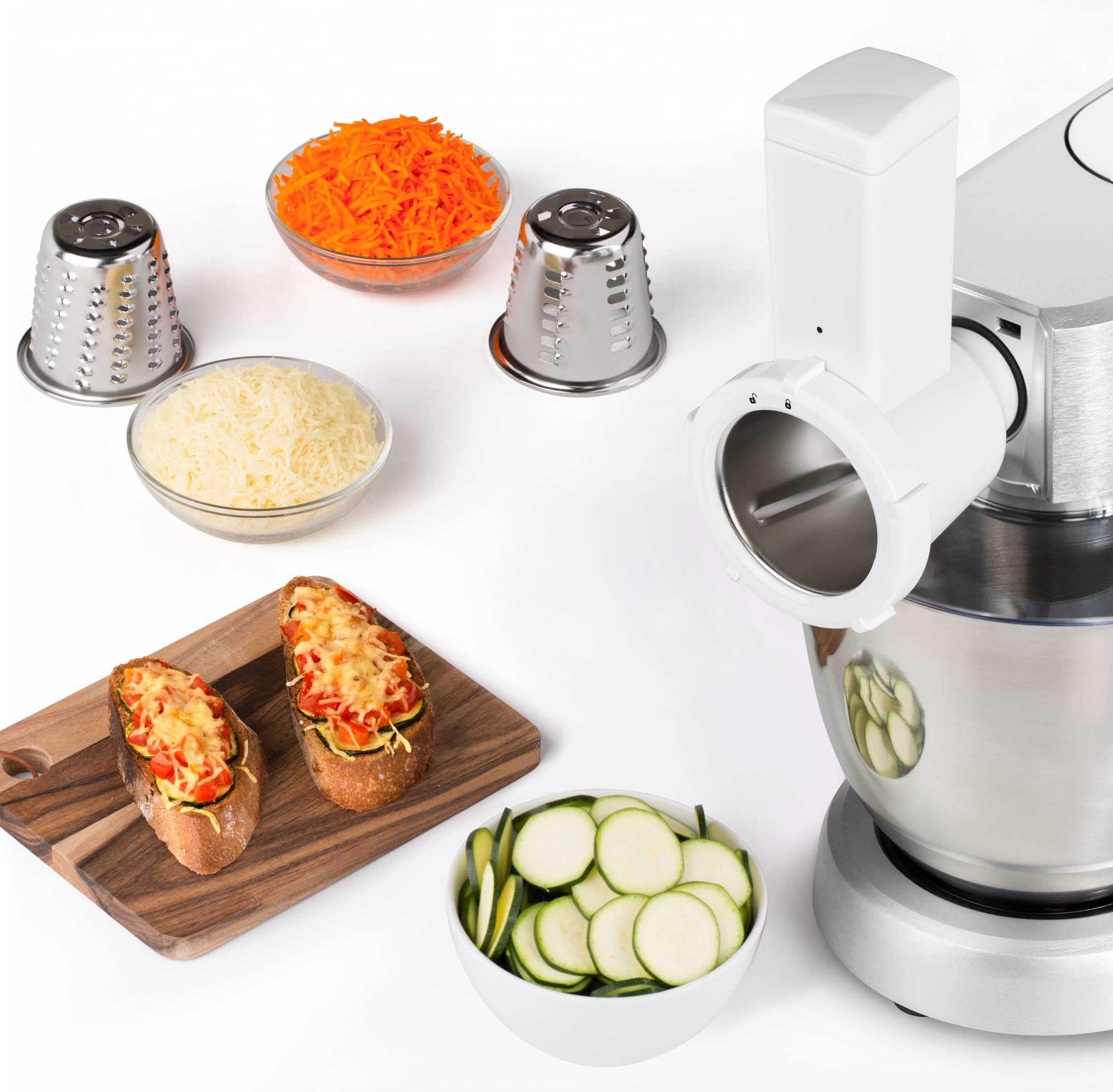 Wejdź na wyższy poziom sztuki domowych wypieków! Dzięki robotowi Masterchef Grande z łatwością zachwycisz bliskich prawdziwymi pysznościami: makaronikami, tartami, bezami, ptysiami czy tortami. Silnik o mocy 1500 W w połączeniu z hakiem do wyrabiania ciasta, mieszadłem i trzepaczką z odlewanego metalu pomogą Ci przygotować ulubione przepisy, jak i opanować do perfekcji nawet te najbardziej skomplikowane. Misa o dużej pojemności 6,7 l umożliwia przygotowanie aż do 2,6 kg ciasta lub 60 babeczek i 2,2 kg ciasta na chleb lub też 10 pizz za jednym razem! Przygotowuj także doskonałe smoothies i pyszne domowe posiłki dla całej rodziny dzięki dołączonym akcesoriom: szklanemu blenderowi, maszynce do mielenia mięsa i rozdrabniaczowi.