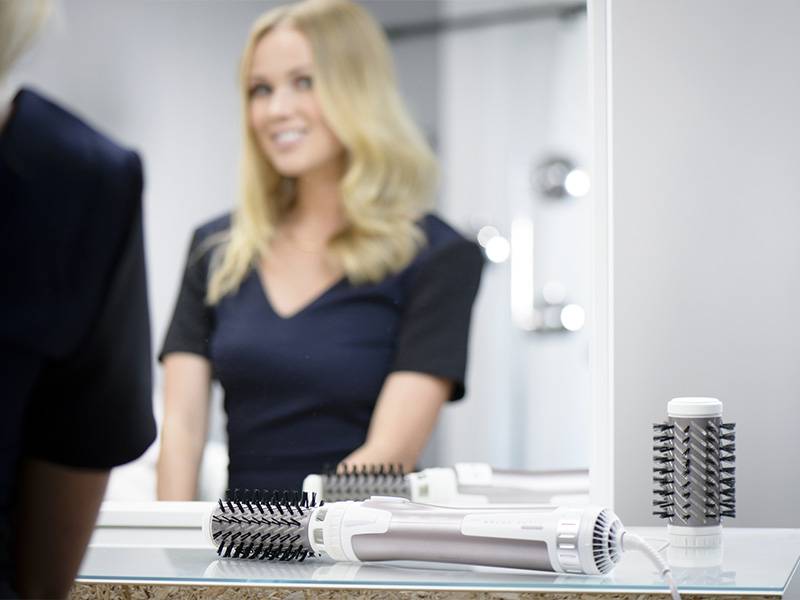 - Najpierw suszenie? Użyj klasycznej końcówki do suszenia, aby pozbyć się nadmiaru wilgoci – dopiero potem sięgnij po szczotkę modelującą, by wymodelować loki, fale lub dodać objętości.