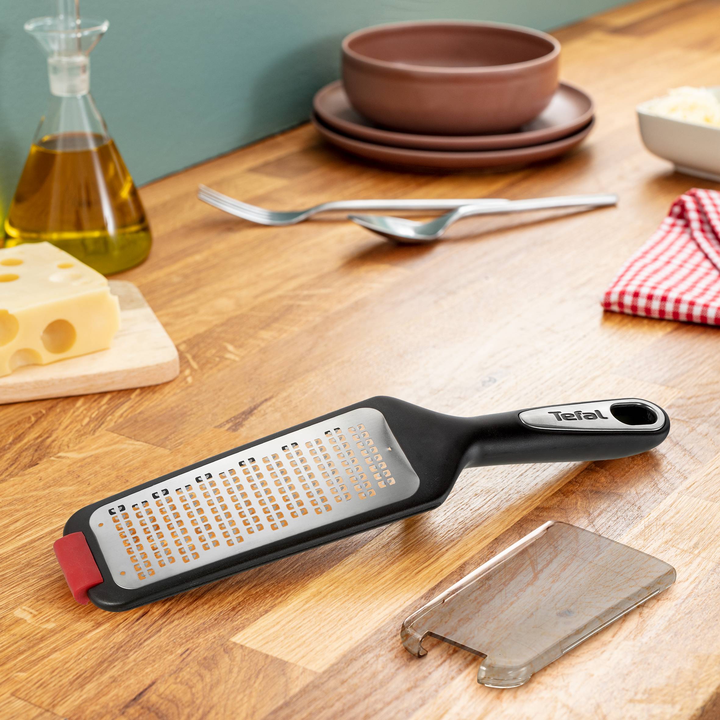 Kolekcja przyborów kuchennych Tefal Ingenio Premium ułatwia realizację nawet najbardziej finezyjnych kulinarnych inspiracji. Bezpieczna, odporna na przebarwienia i łatwa do umycia tarka Tefal Ingenio Premium została wyposażona w innowacyjne, antypoślizgowe podkładki zapewniające stabilność i wygodę. Ostre tarki zapewniają optymalne i wyjątkowo szybkie efekty. Wykonana z wysokiej jakości trwałych materiałów dwustronna tarka ze stali nierdzewnej jest wyposażona w osłonę do bezpiecznego przechowywania.
