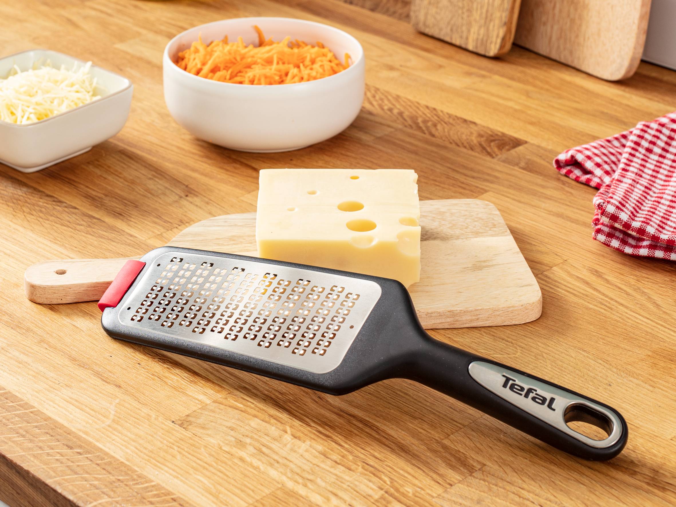 Zobacz, jak możesz ułatwić sobie pracę w kuchni! Bezpieczna, odporna na przebarwienia i wygodna do umycia tarka Tefal Ingenio Premium została wyposażona w innowacyjne, antypoślizgowe podkładki zapewniające stabilność bez względu na użyty pojemnik.