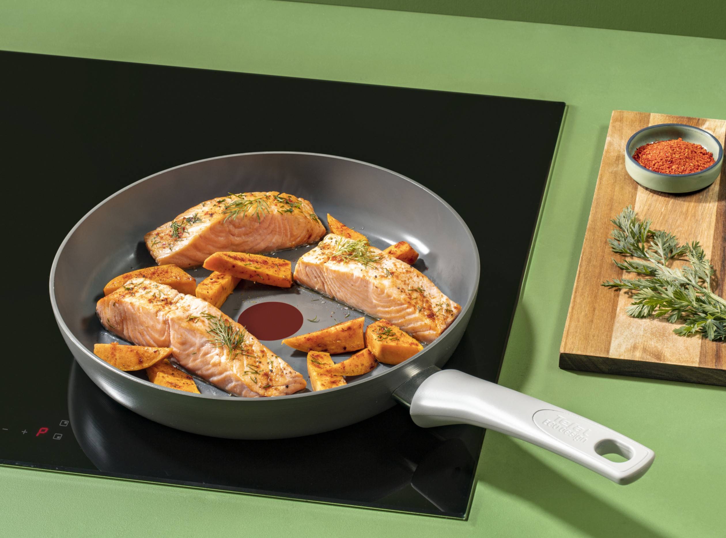 Mniejszy wpływ na środowisko, smaczniejsze posiłki! Renew Tefal to innowacyjny zestaw patelni z powłoką ceramiczną, które zapewniają zupełnie nowy sposób gotowania. Poznaj patelnie zaprojektowane z myślą o mniejszym wpływie na środowisko i wyprodukowane we Francji, które dzięki przemyślanym rozwiązaniom gwarantują łatwe gotowanie. Aluminiowa konstrukcja patelni Renew powstała w 100% z materiałów z recyklingu* a bezpieczna, trwała, nieprzywierająca powłoka ceramiczna nowej generacji zapewnia łatwy poślizg — teraz przygotowanie zdrowych posiłków dzień po dniu nie wymaga grama tłuszczu! Patelnie wyposażono we wskaźnik ciepła Thermo-Signal™, który informuje o idealnej temperaturze do rozpoczęcia smażenia. Linia Renew jest kompatybilna ze wszystkimi płytami kuchennymi, w tym indukcyjnymi, a dzięki zakładanej i zdejmowanej rączce zajmie minimum miejsca, gwarantując maksimum możliwości!