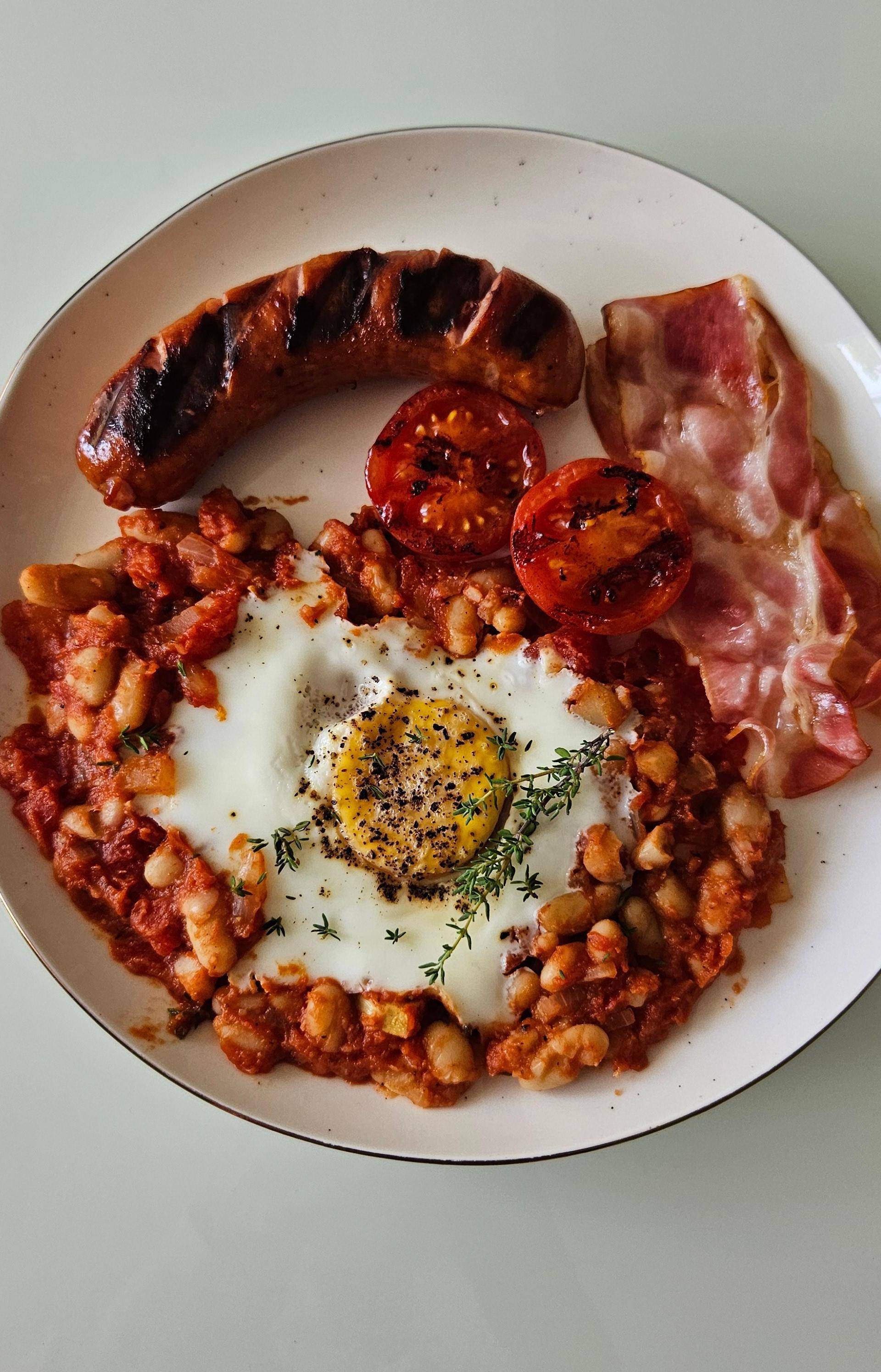 W sosie z fasolka robimy 2 wgłębienia i wbijamy jajka. Zamykamy grilla na 3 do 4 min, aby jajka się usmażyły. Przekładamy na talerz.