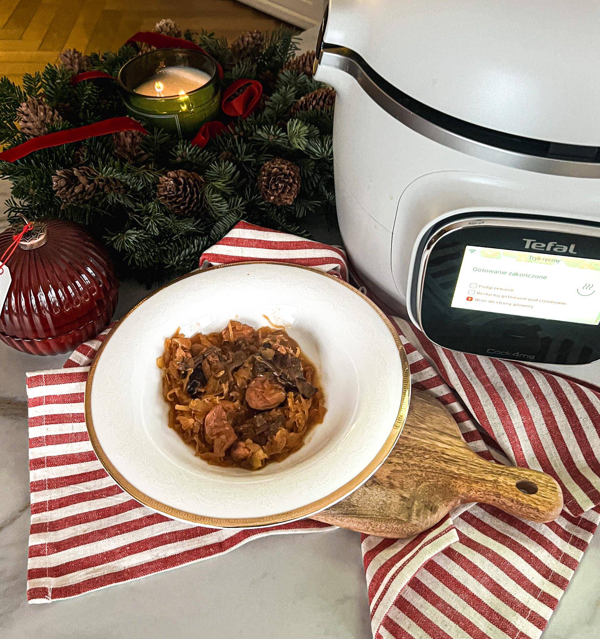 Wlej wodę z grzybów i z kiszonej kapusty. Dodaj kapustę oraz wszystkie przyprawy. Gotuj pod ciśnieniem.