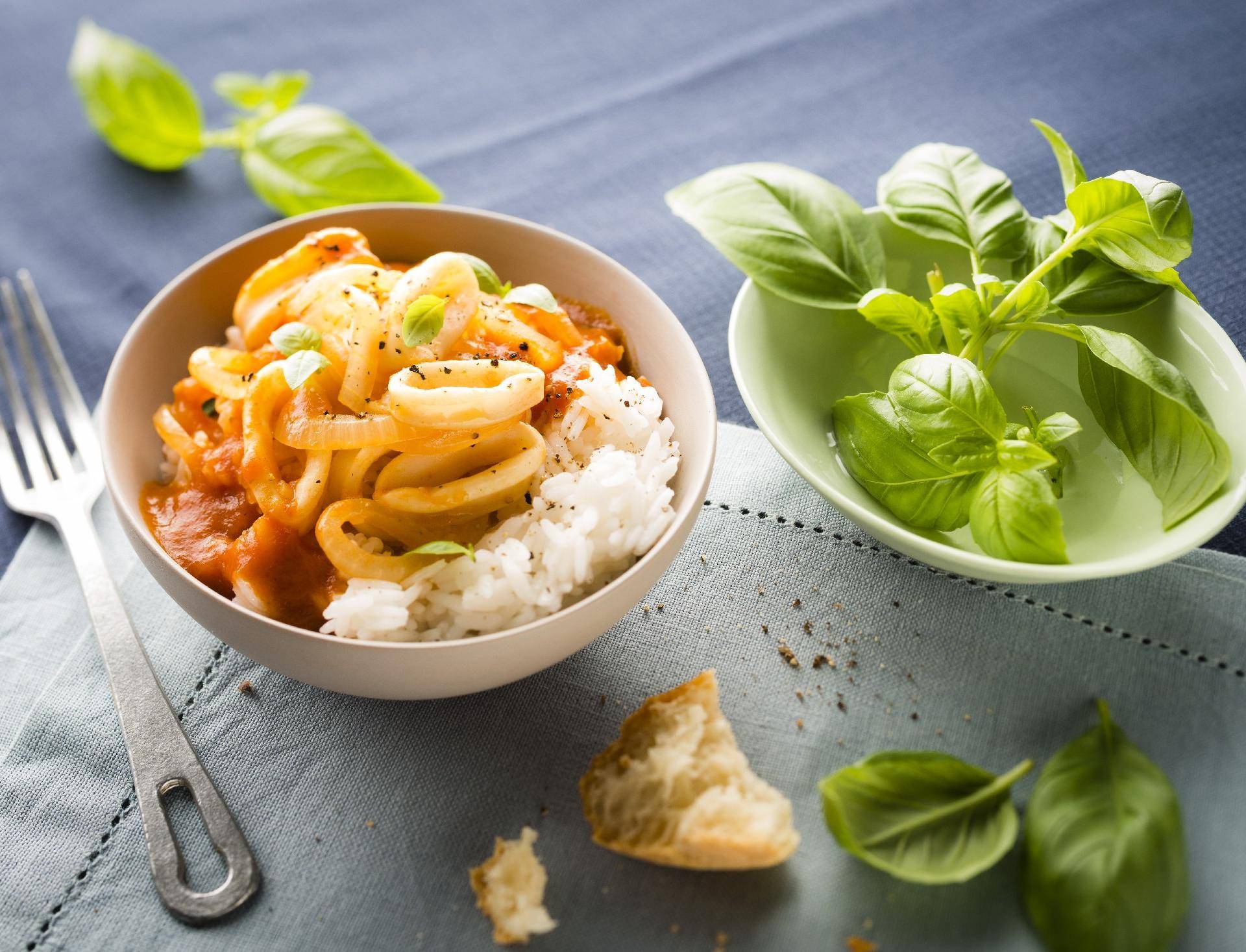 Wlać oliwę na dno misy, ułożyć 3 kawałki ryby, na rybę rozłożyć połowę cebuli. Cebulę posolić (0.5 łyżeczki soli), następnie rozłożyć połowę pomidorów i posypać łyżeczką ziół prowansalskich.