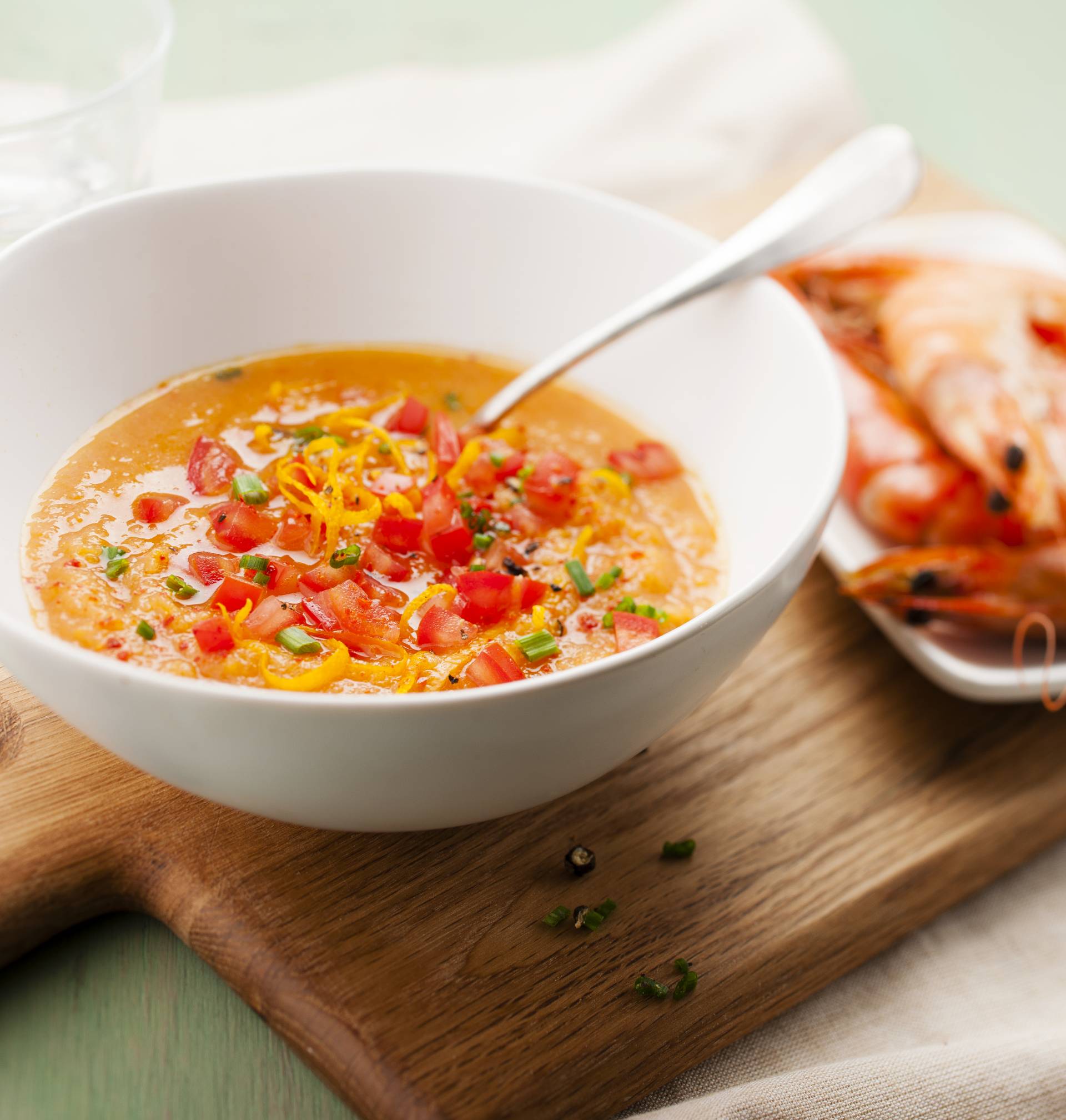 Wlej do misy wodę, krewetki, pomidory, marchewkę i seler.