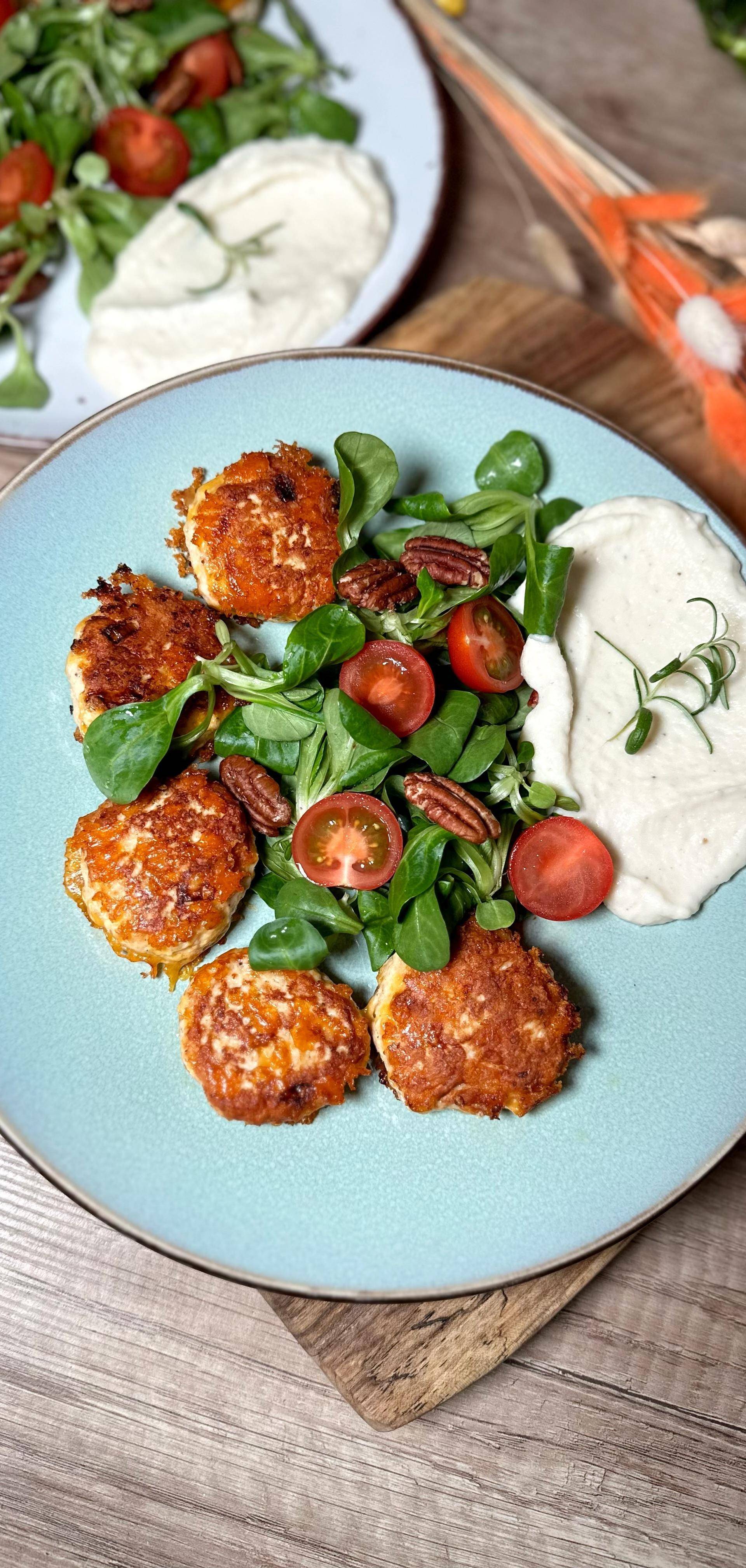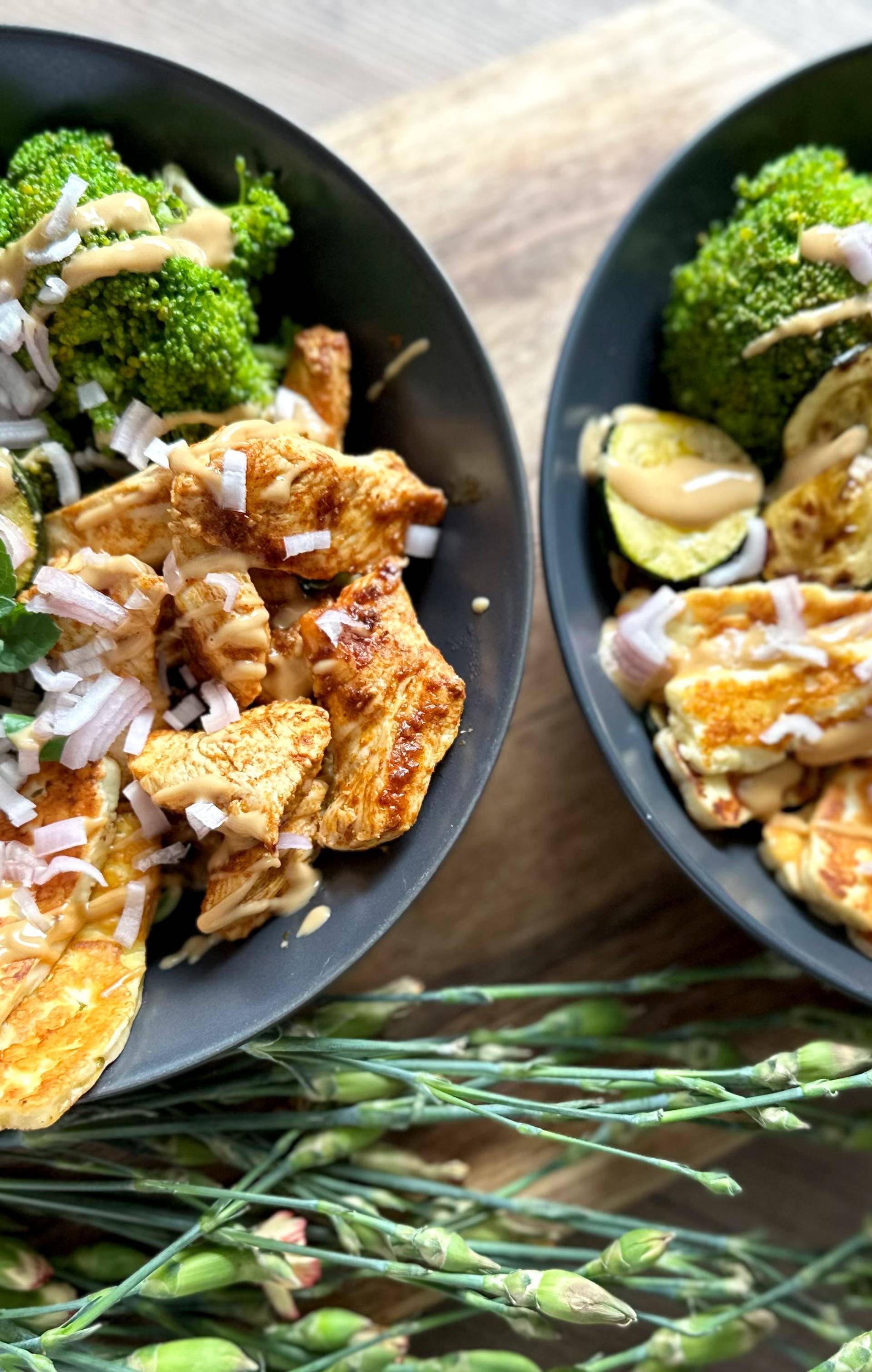 Wyłóż pozostałe warzywa w formie bowla razem z usmażonym na patelni wcześniej serem halloumi.