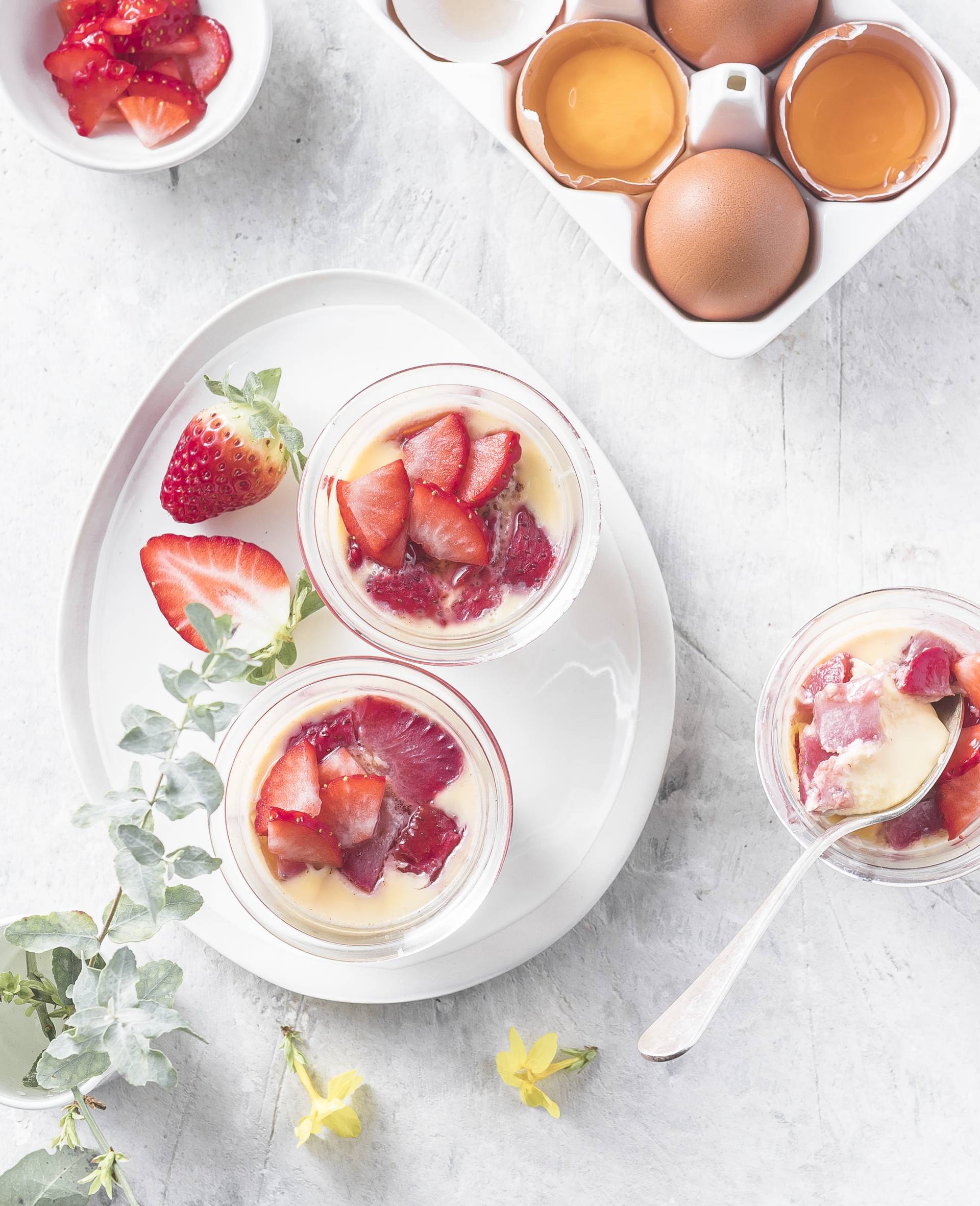 Rozłóż truskawki do szklanych kokilek, zalej je mieszanką i zamknij.