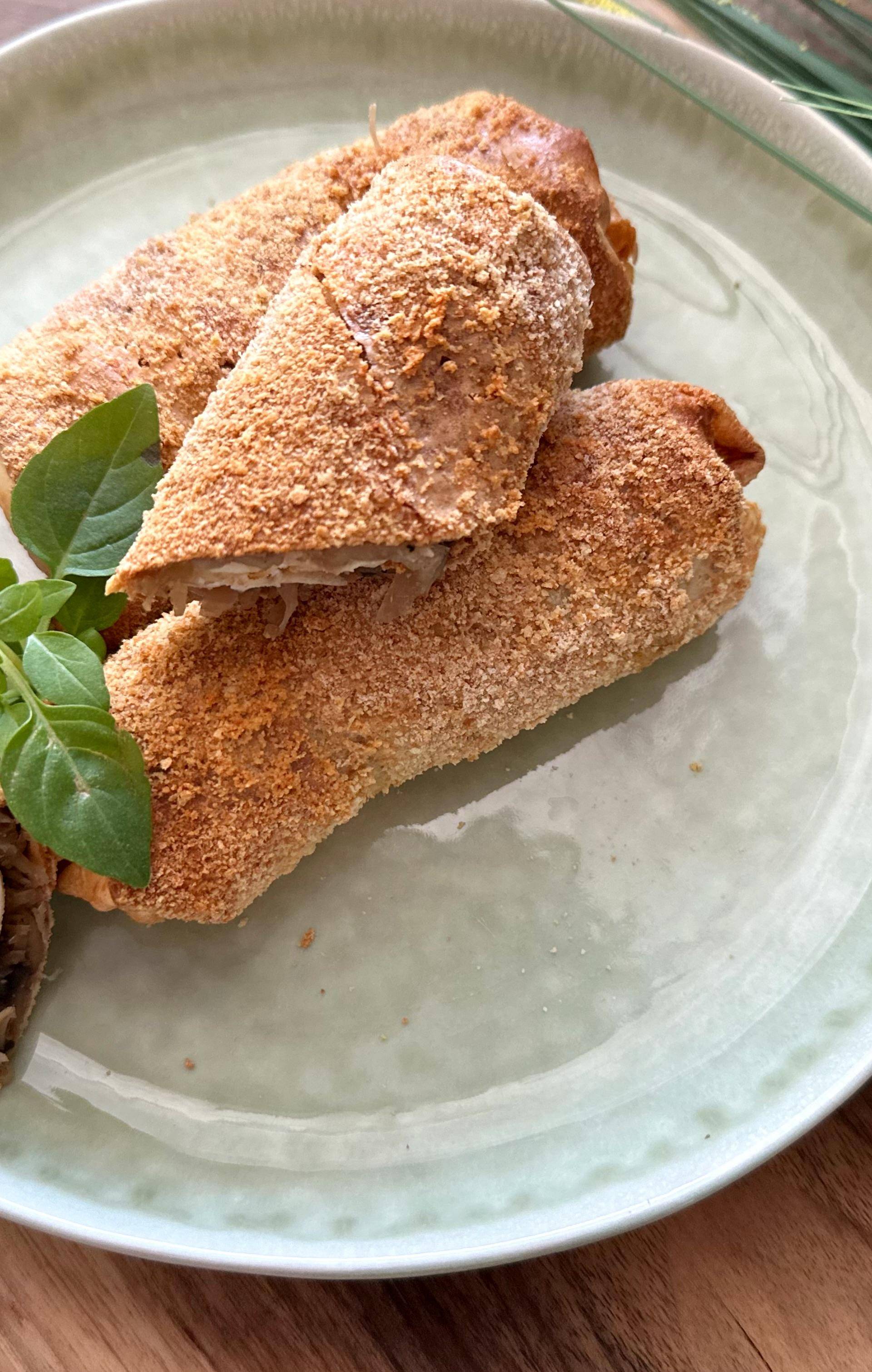 Naleśniki nadziewaj gotowym farszem i zwiń w rulon. Obtocz w jajku i bułce tartej keto (można w zmielonych migdałach).