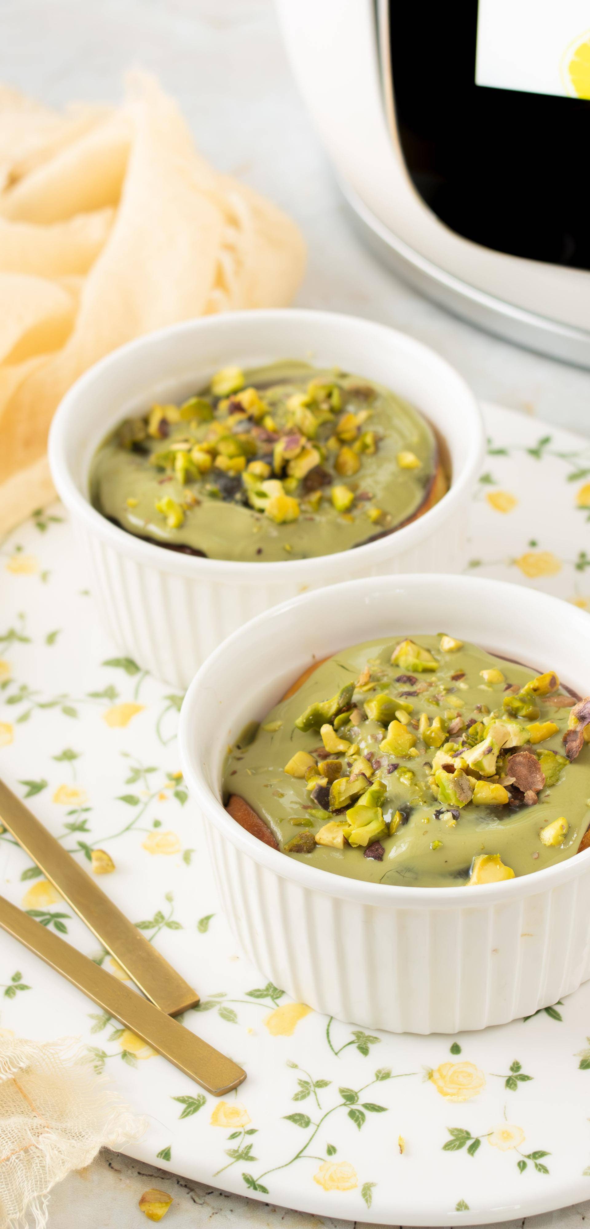 Wstaw naczynia żaroodporne do misy urządzenia, nałóż nakładkę Extra Crisp i ustaw czas pieczenia na 20 min oraz 160°C, po czym naciśnij Start. W międzyczasie posiekaj pistacje na drobne kawałki.