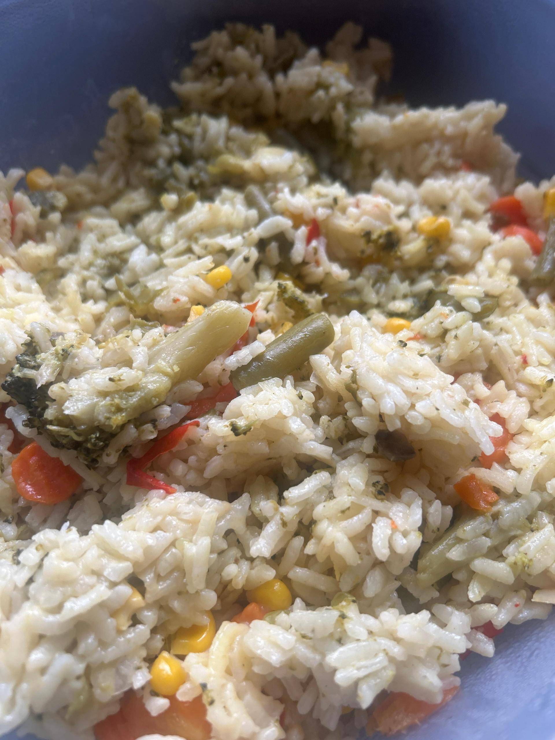 Następnie dodajemy mieszankę warzyw oraz bulion i na średnim ciśnieniu gotujemy 8 minut.