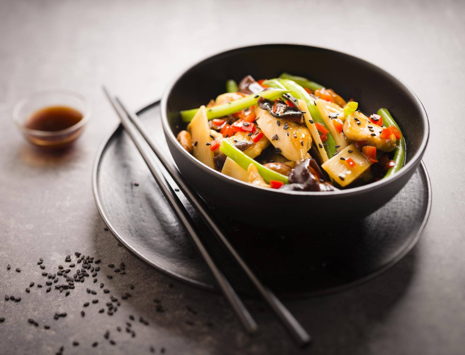 Przekrój grzyby na pół (jeśli są małe, nie musisz tego robić). Wsyp je do drugiej miski marynaty. Mocz bambusowe pałeczki w wodzie przez 15 minut.