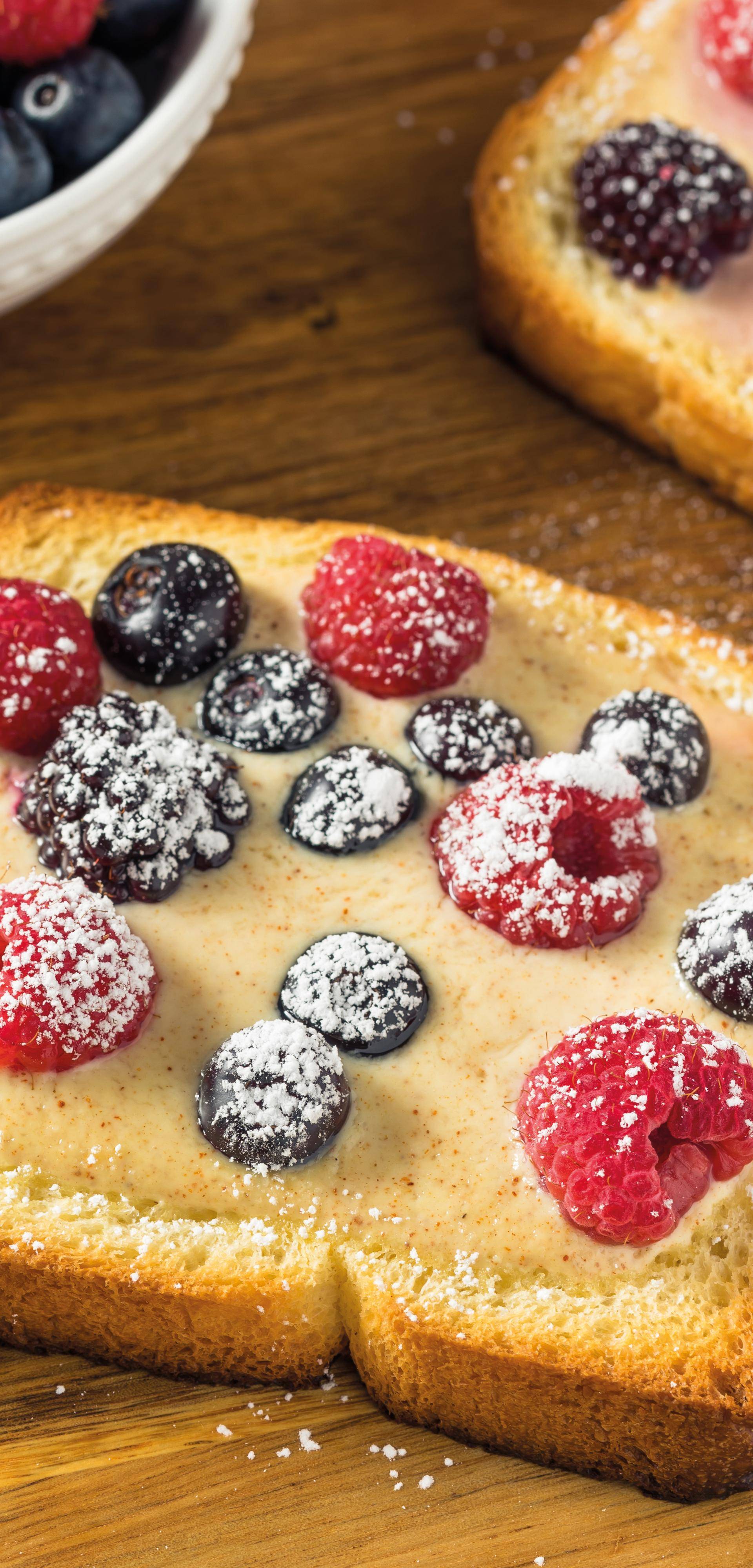Weź łyżkę i wyciśnij środek każdej kromki brioszki, aby utworzyć miejsce na śmietanę. Polej każdy tost śmietaną. Posyp owocami leśnymi.