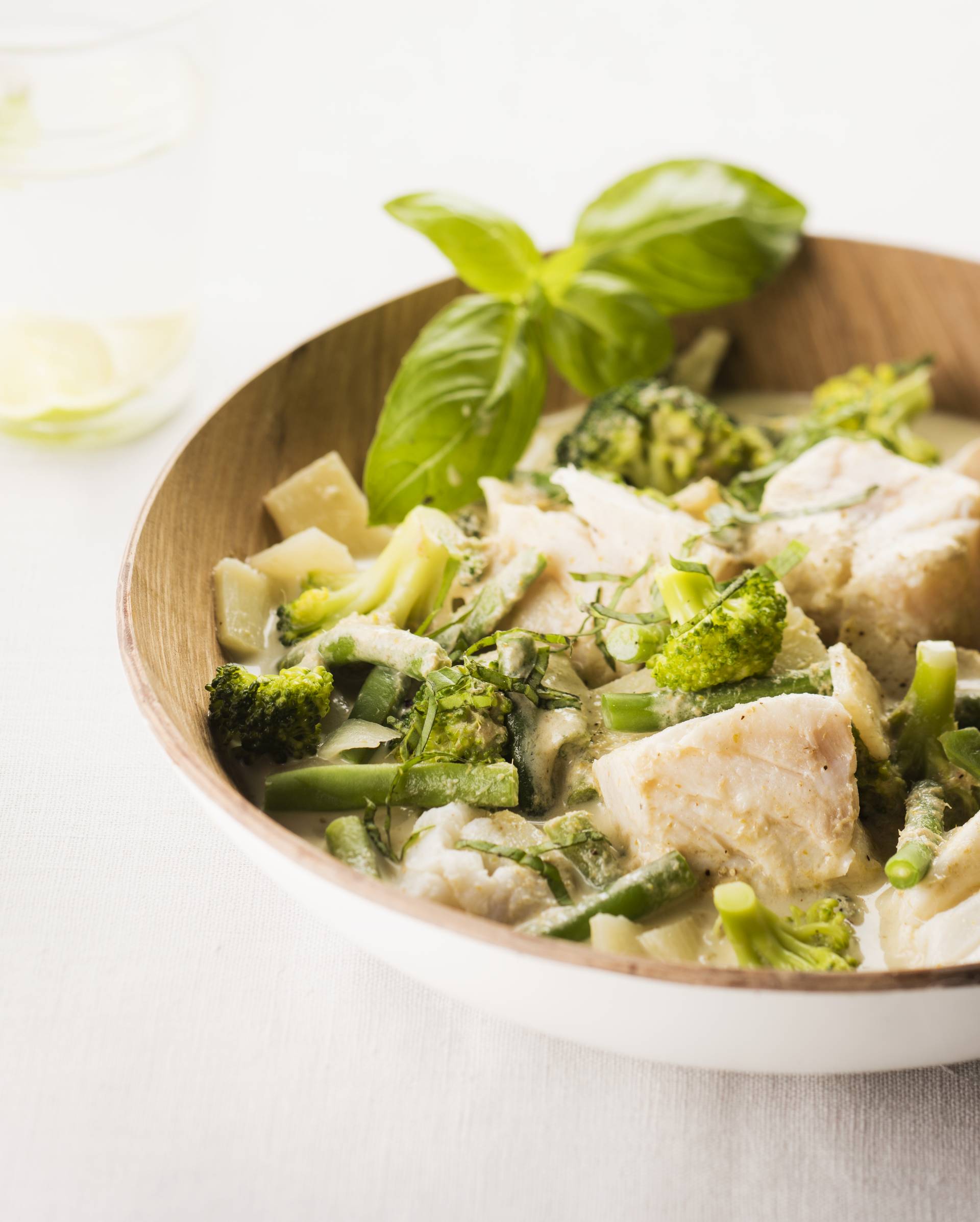 Podgrzewaj, a następnie dodaj pastę curry. Wsyp różyczki brokułów. Po 4 minutach dodaj pozostałe warzywa i rybę. Gotuj.