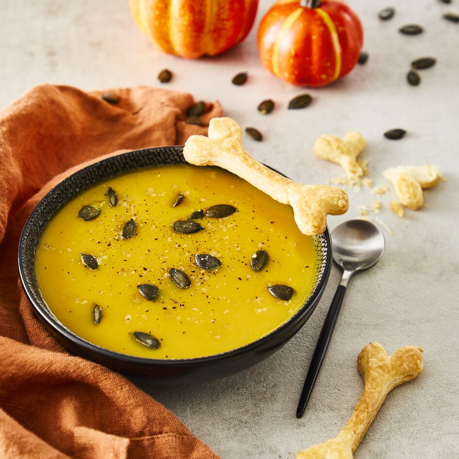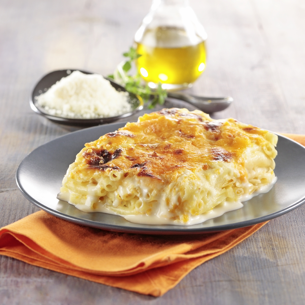 Wrzuć makaron do naczynia do pieczenia. Na górze połóż plasterki dyni. Posyp tartym serem cantal.