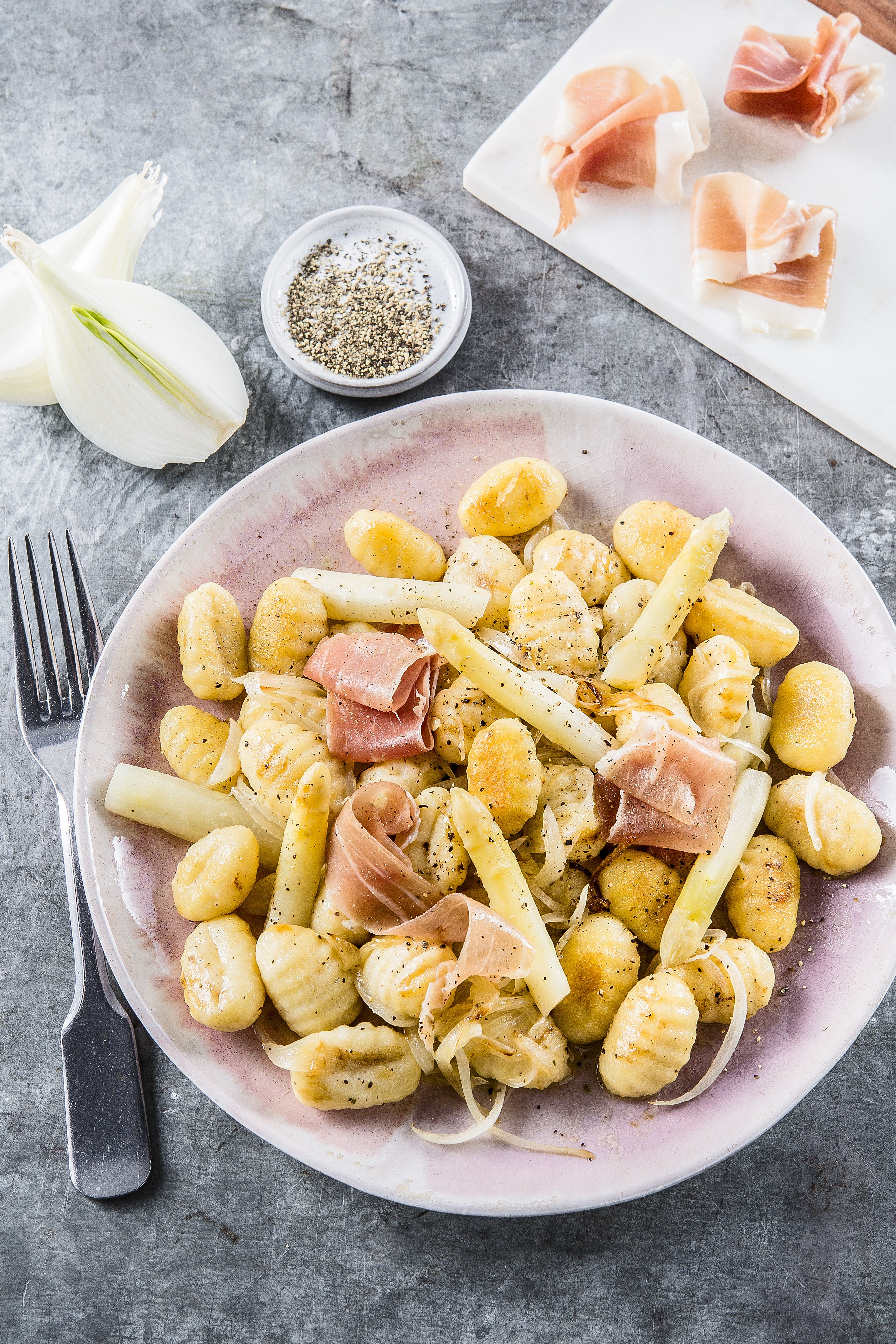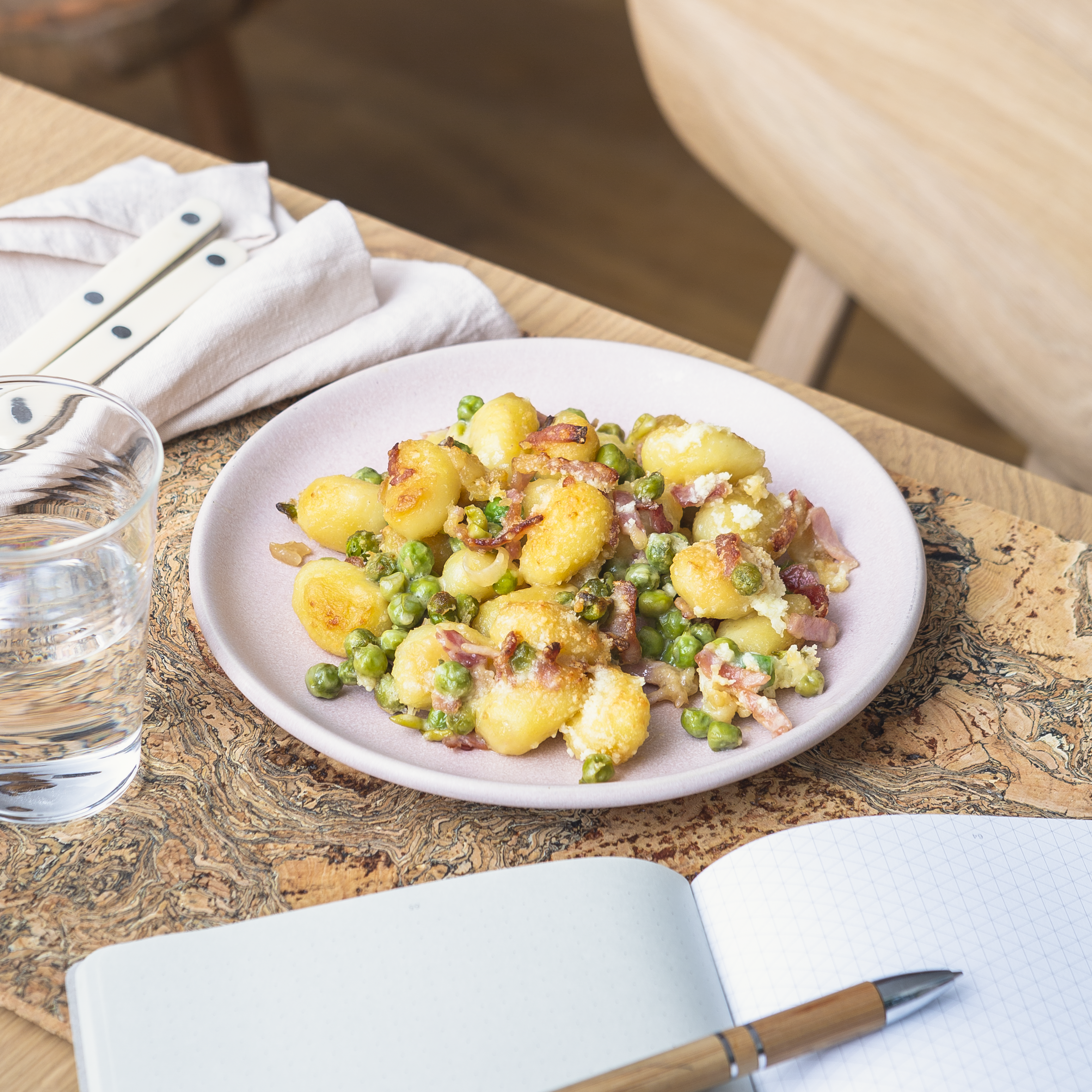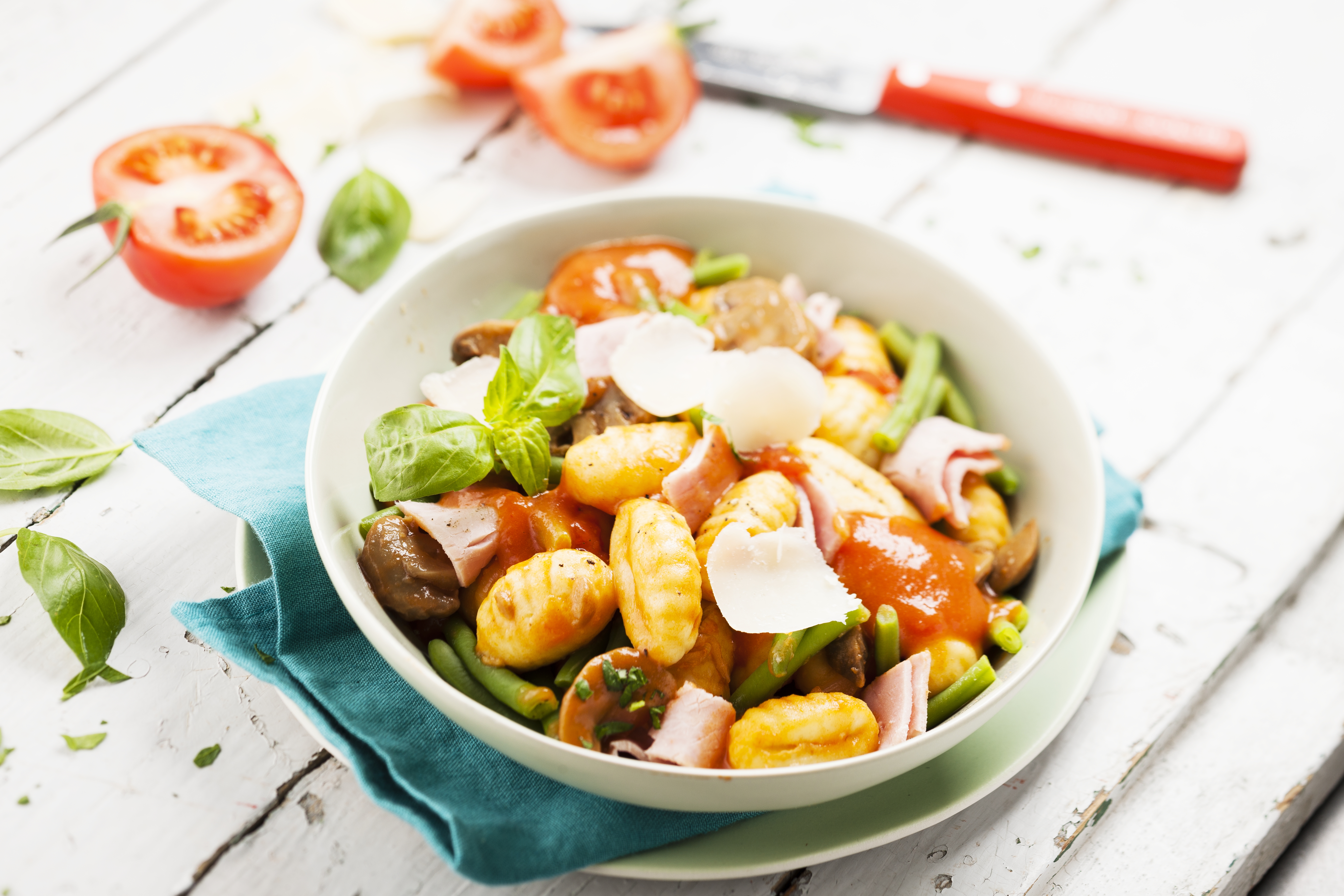 Połowę zawartości przełóż na talerz, a na górze połóż gnocchi. Włóż standardową tacę do urządzenia. Włóż naczynie do miski do gotowania. Ustaw program PIECZENIE BEZTŁUSZCZOWE i piecz przez 20 minut w temperaturze 200°C. Wymieszaj w połowie pieczenia.