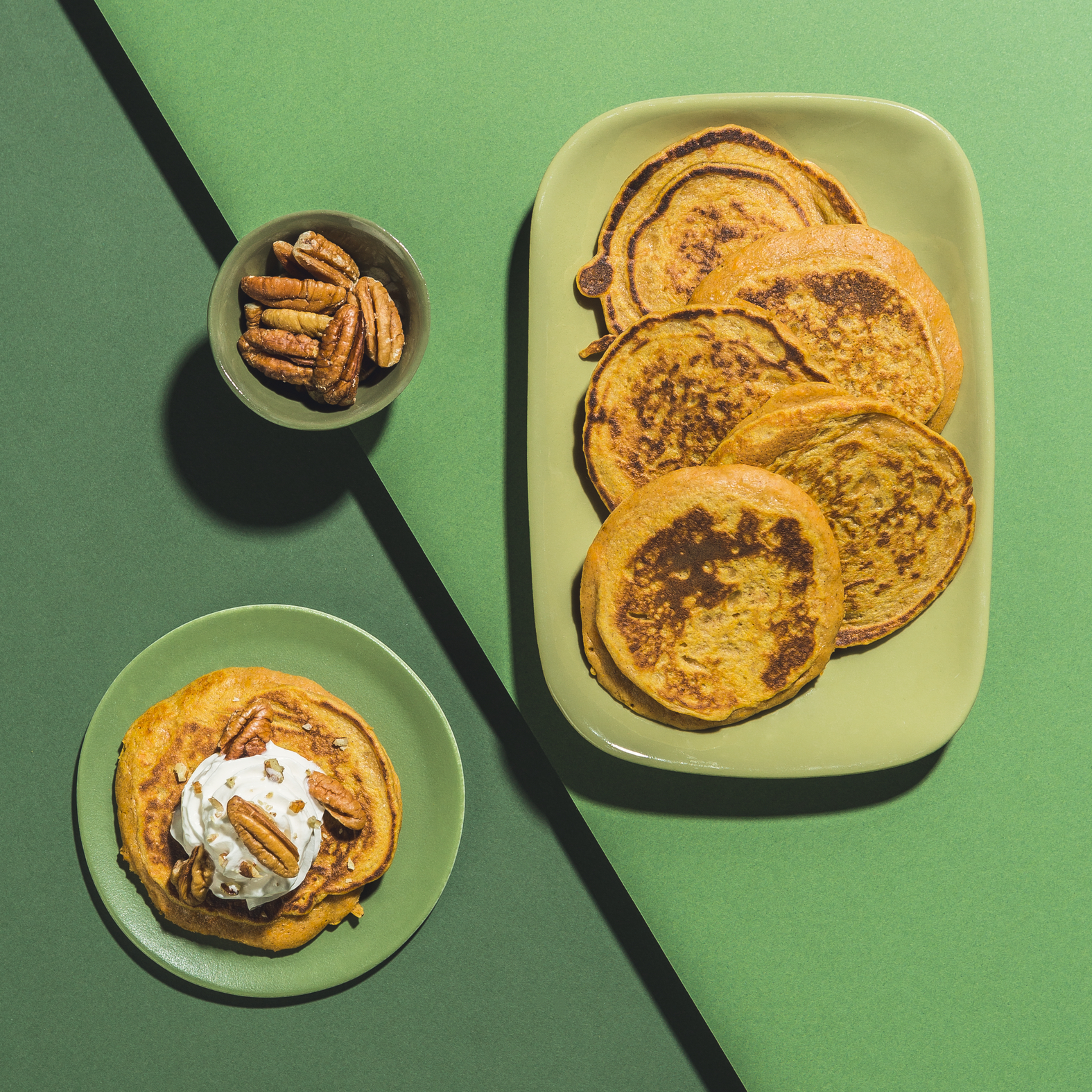 Po zakończeniu gotowania w trybie Piekarnik włącz grilla w trybie Kompletny posiłek i ustaw termostat na 4. Obróć dyniowe szaszłyki i wlej 4 duże pełne łyżki ciasta na płytę grillową. Piecz przez 5 minut, a następnie obróć naleśniki i piecz przez kolejne 5 minut. Połóż na talerzu i odstaw na bok, a następnie zrób to samo z pozostałym ciastem i ponownie obróć szaszłyki.
