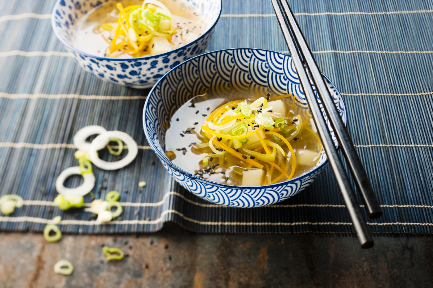 Rozgrzej urządzenie, a następnie dodaj 1 łyżkę oleju roślinnego. Wrzuć pociętego pora i seler naciowy. Smaż często mieszając. Na pół minuty przed końcem dodaj czosnek.