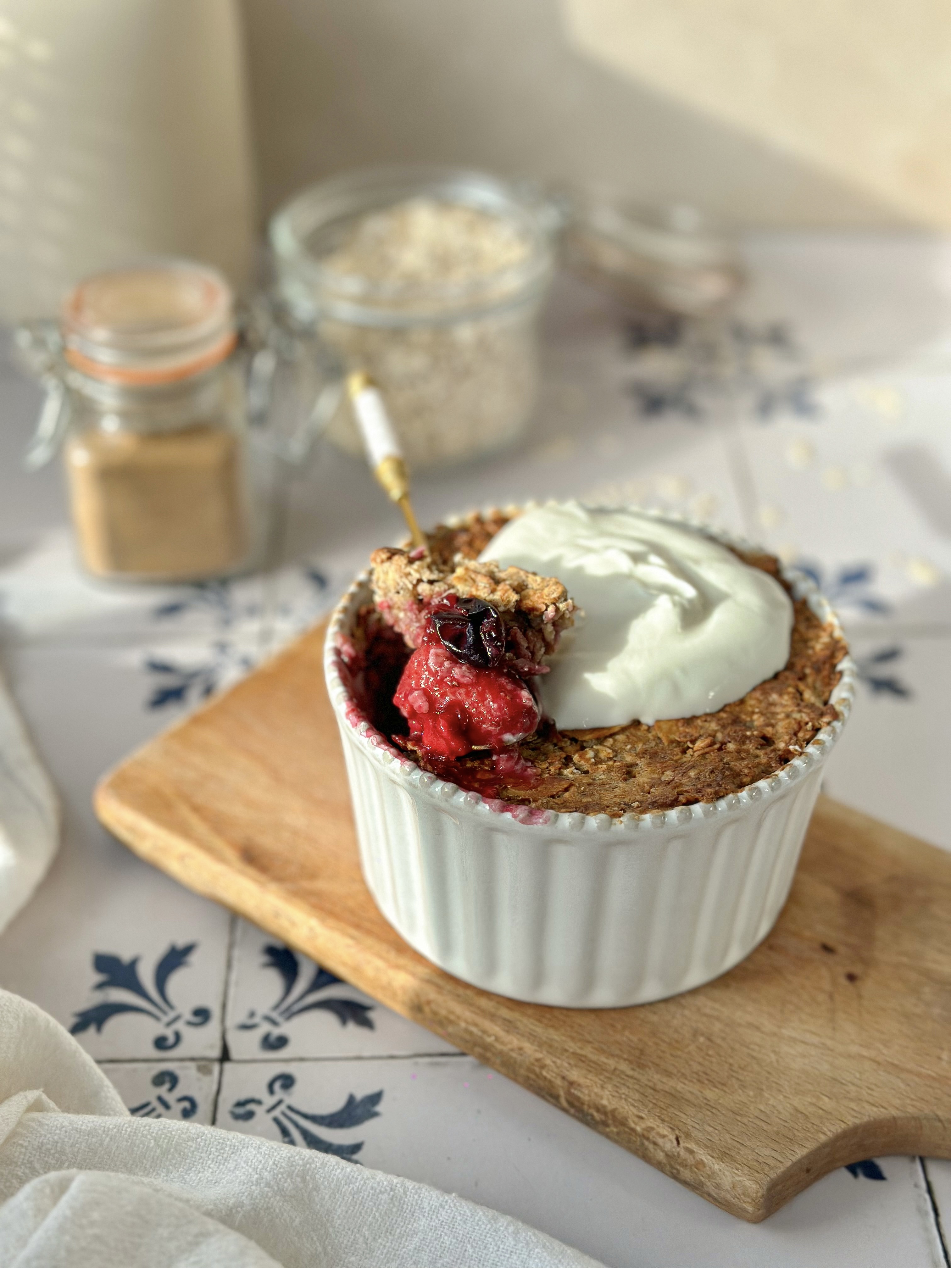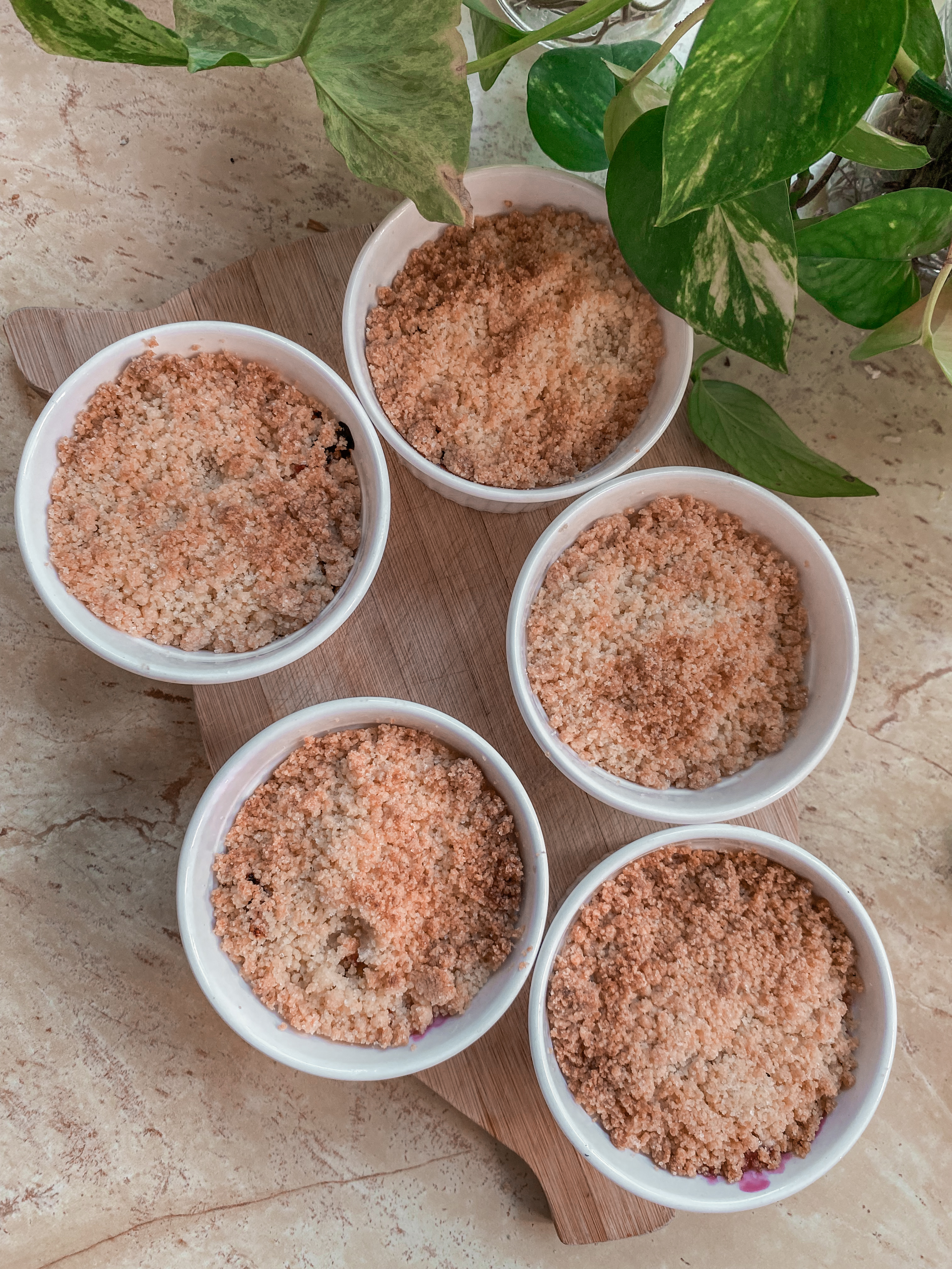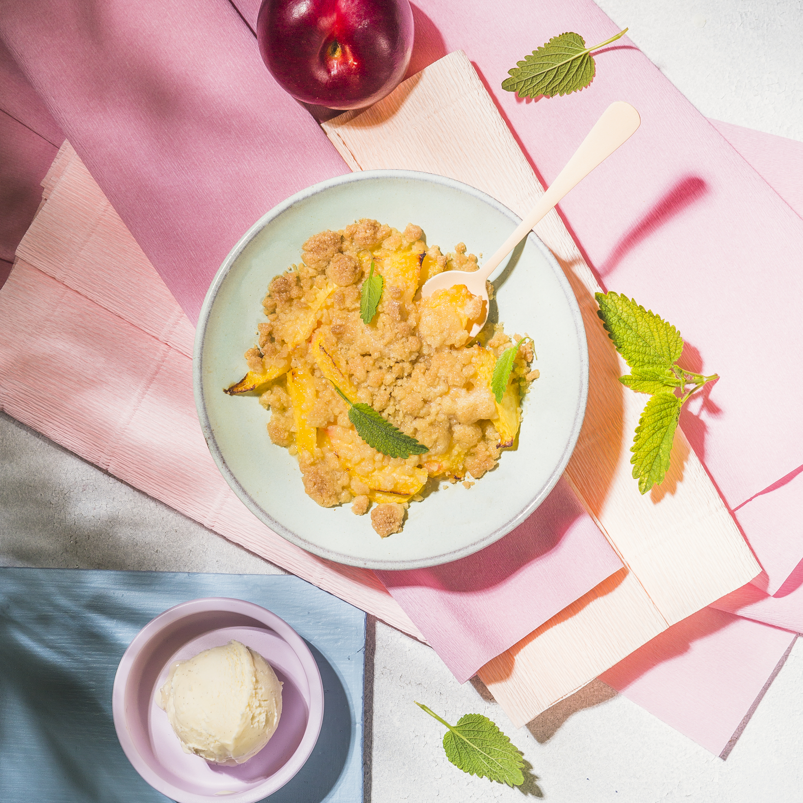 Obierz i pokrój jabłko w kostkę o boku 0,5 cm. Umieść kostki w pojemniku, a następnie dodaj czerwone owoce, cukier i mąkę kukurydzianą. Dokładnie wymieszaj. Wlej masę do formy do pieczenia ciast pasującej do urządzenia. Odstaw na bok. Wymieszaj w pojemniku wszystkie składniki na kruche ciasto. Wymieszaj opuszkami palców. Kontynuuj, aż masa będzie przypominać kruszonkę, a następnie rozprowadź ją na owocach w formie.
