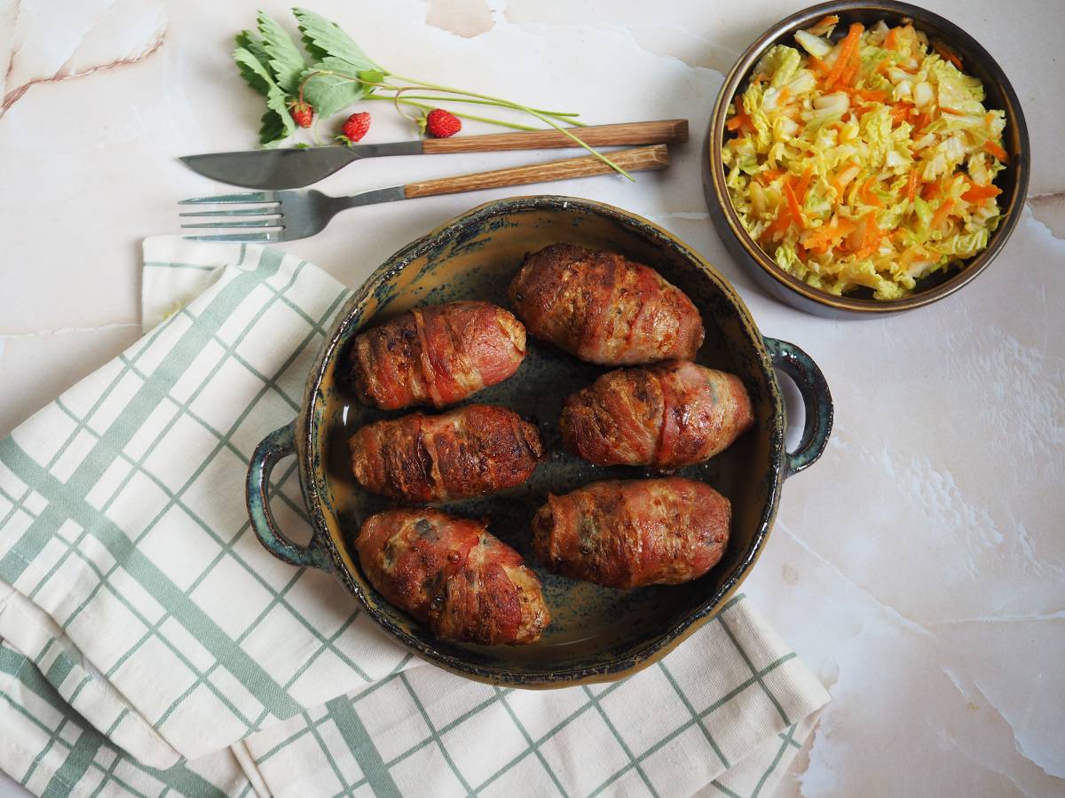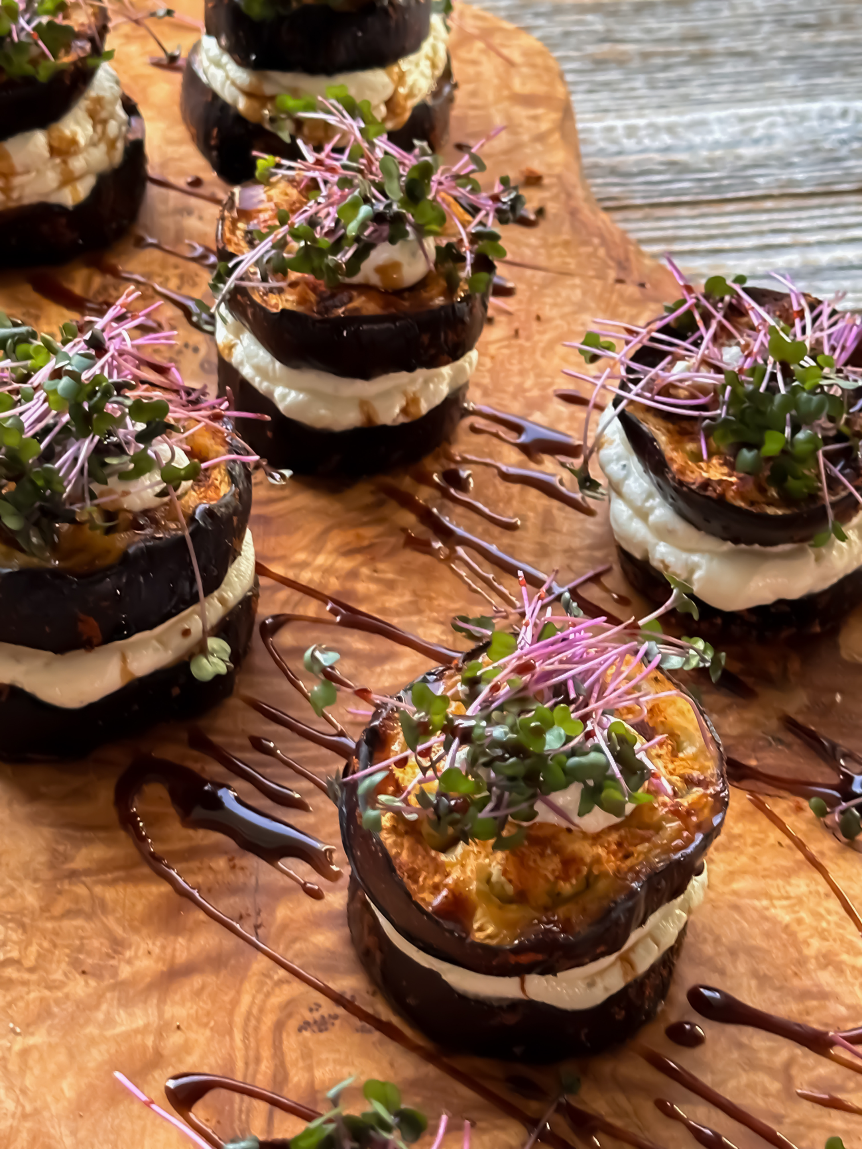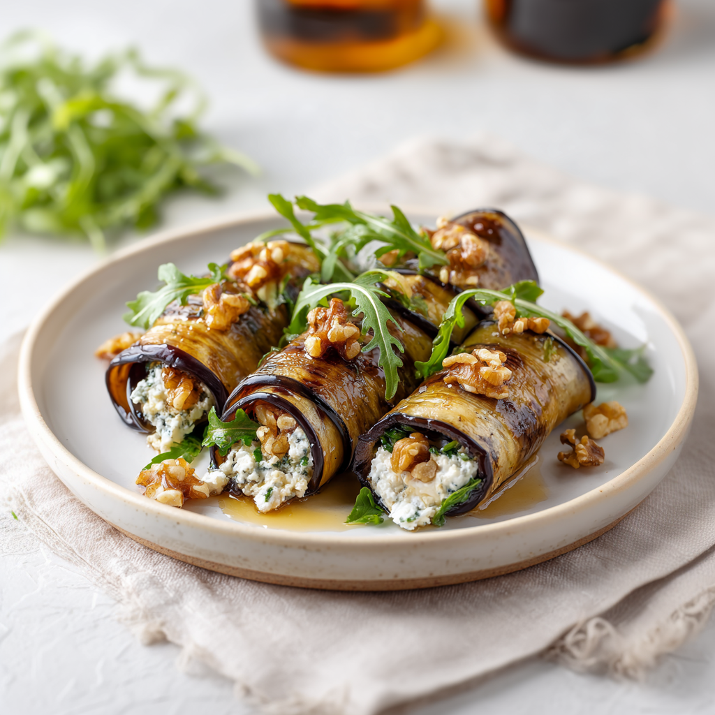 W pojemniku wymieszaj sos pomidorowy, cebulę, czosnek, oregano, sól, oliwę z oliwek i pieprz. Odstaw na bok. Umieść kawałek mozzarelli na jednym końcu plastra bakłażana i ostrożnie zwiń plaster, aby utworzyć roladkę. Powtórz tę czynność dla pozostałych plastrów.