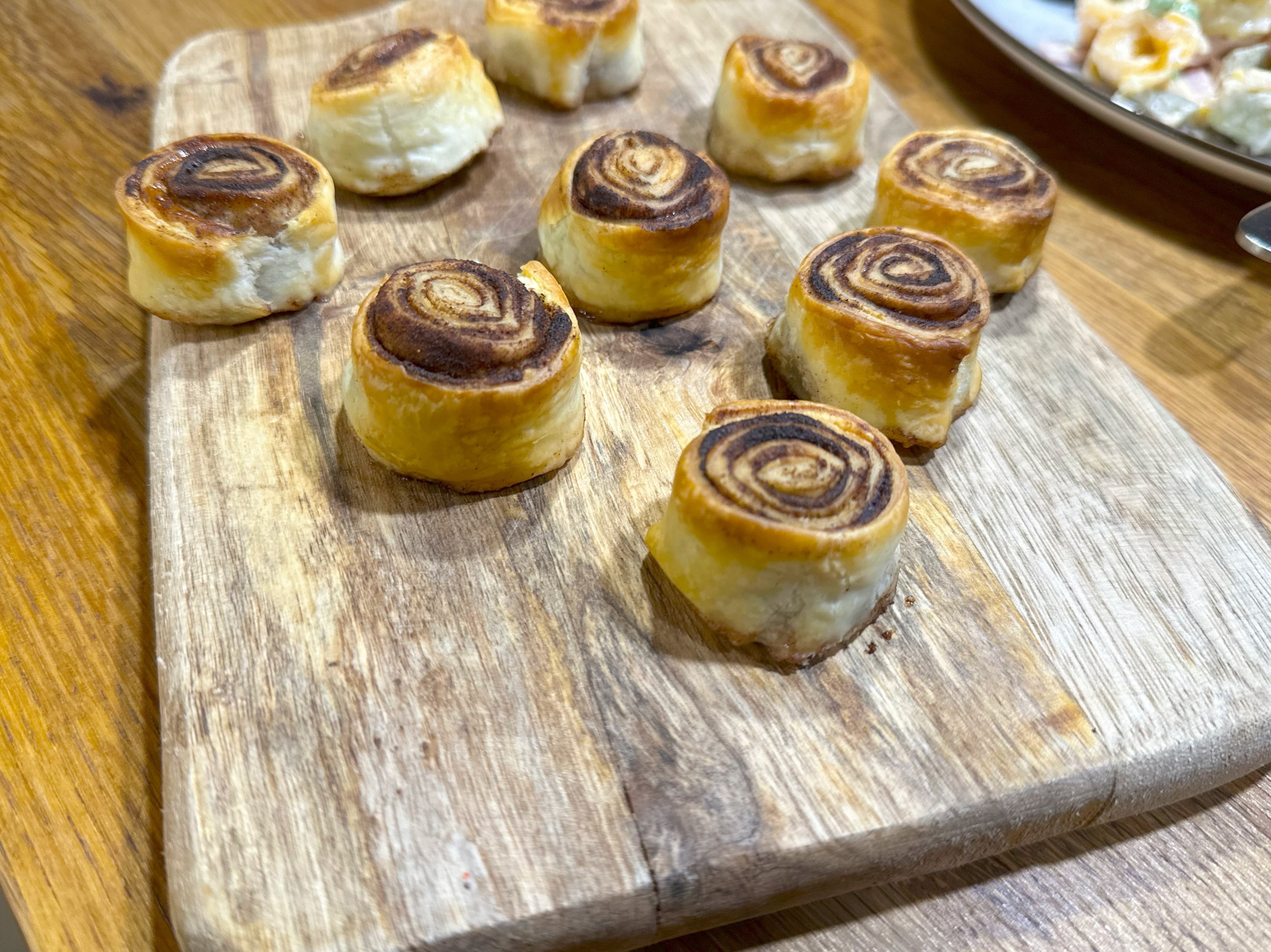 Ciasto francuskie rozwiń i pokrój na kwadraty o boku ok. 8 cm. Najpierw nożem przejedź w poziomie krojąc paski, a następnie poprowadź nóż pionowo tworząc kratkę. Na każdy kwadracik nałóż niewielką łyżeczkę sera i trochę jabłek. Złap dwa rogi po skosie i zaciśnij je, następnie złap kolejne dwa rogi i doklej je do poprzednich dociskając z wyczuciem. Boków nie musisz zalepiać. Otwory które zostaną gdzieniegdzie w niczym nie przeszkadzają.