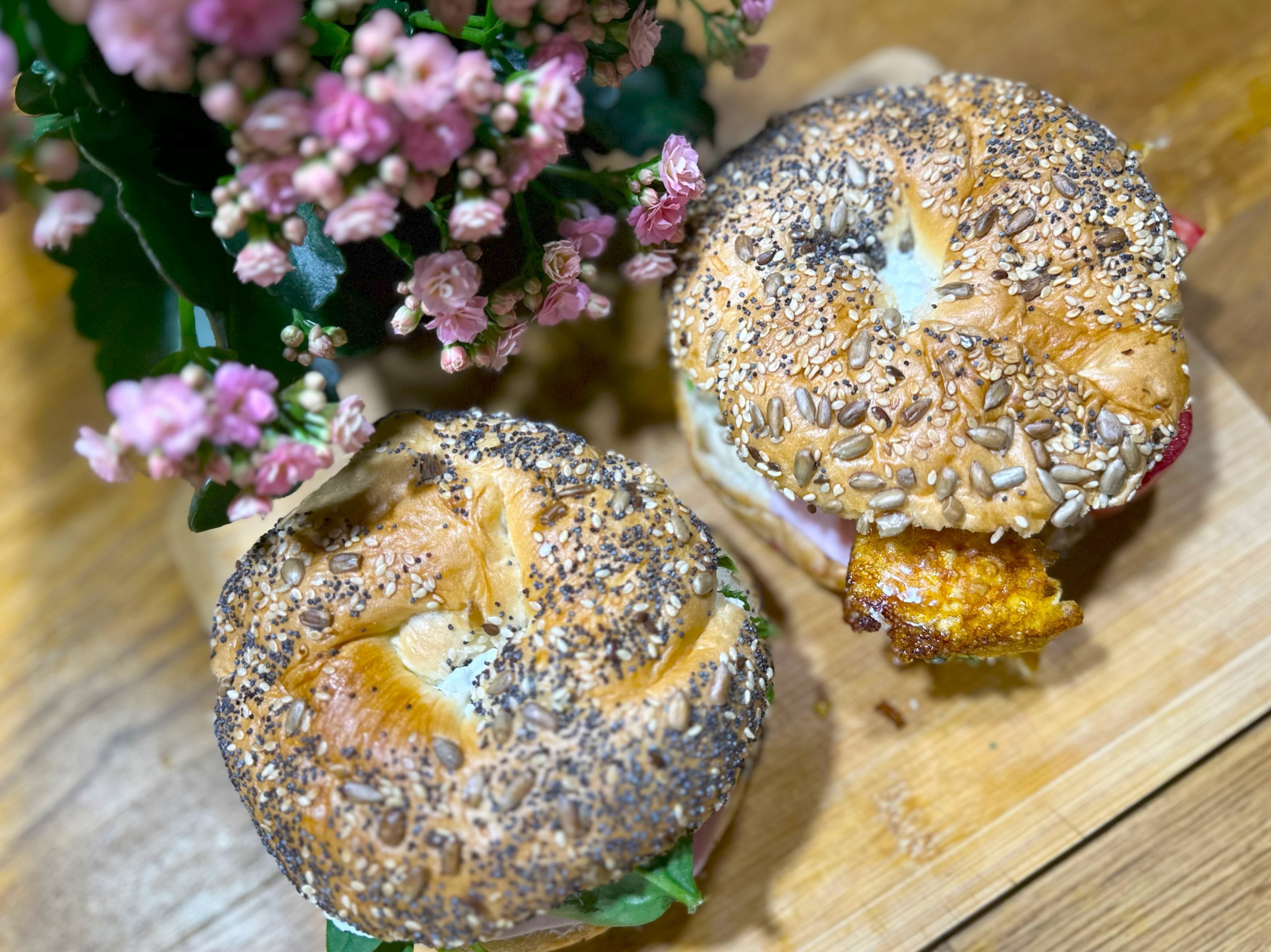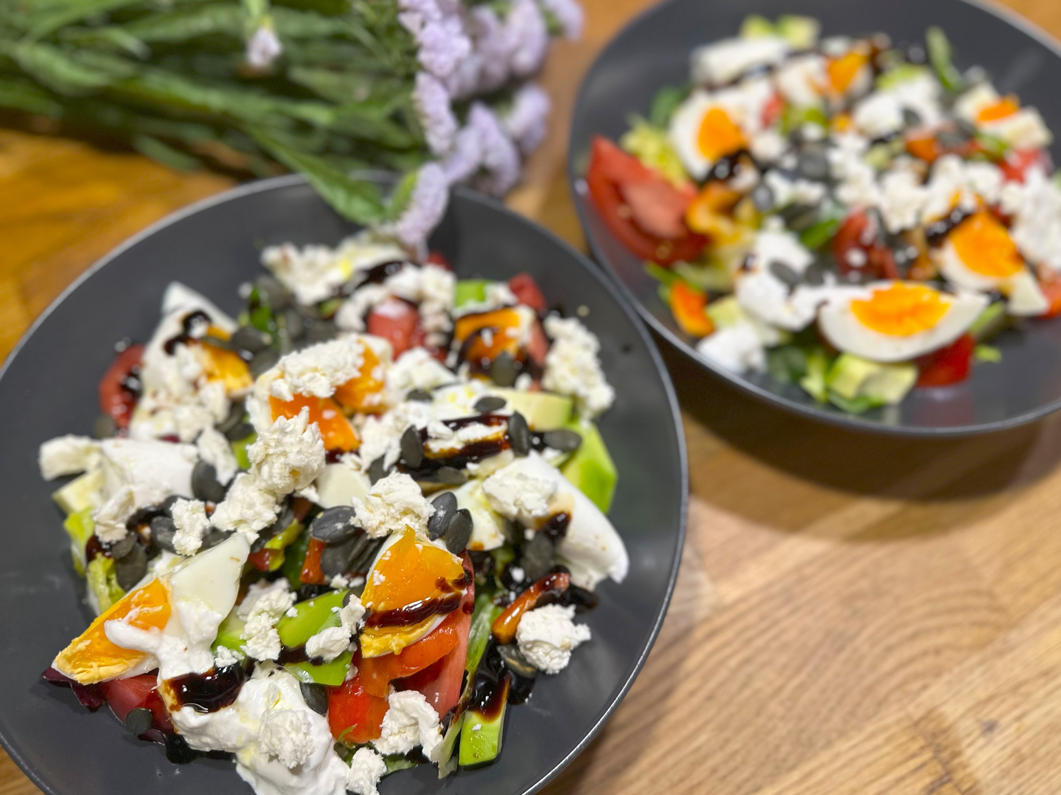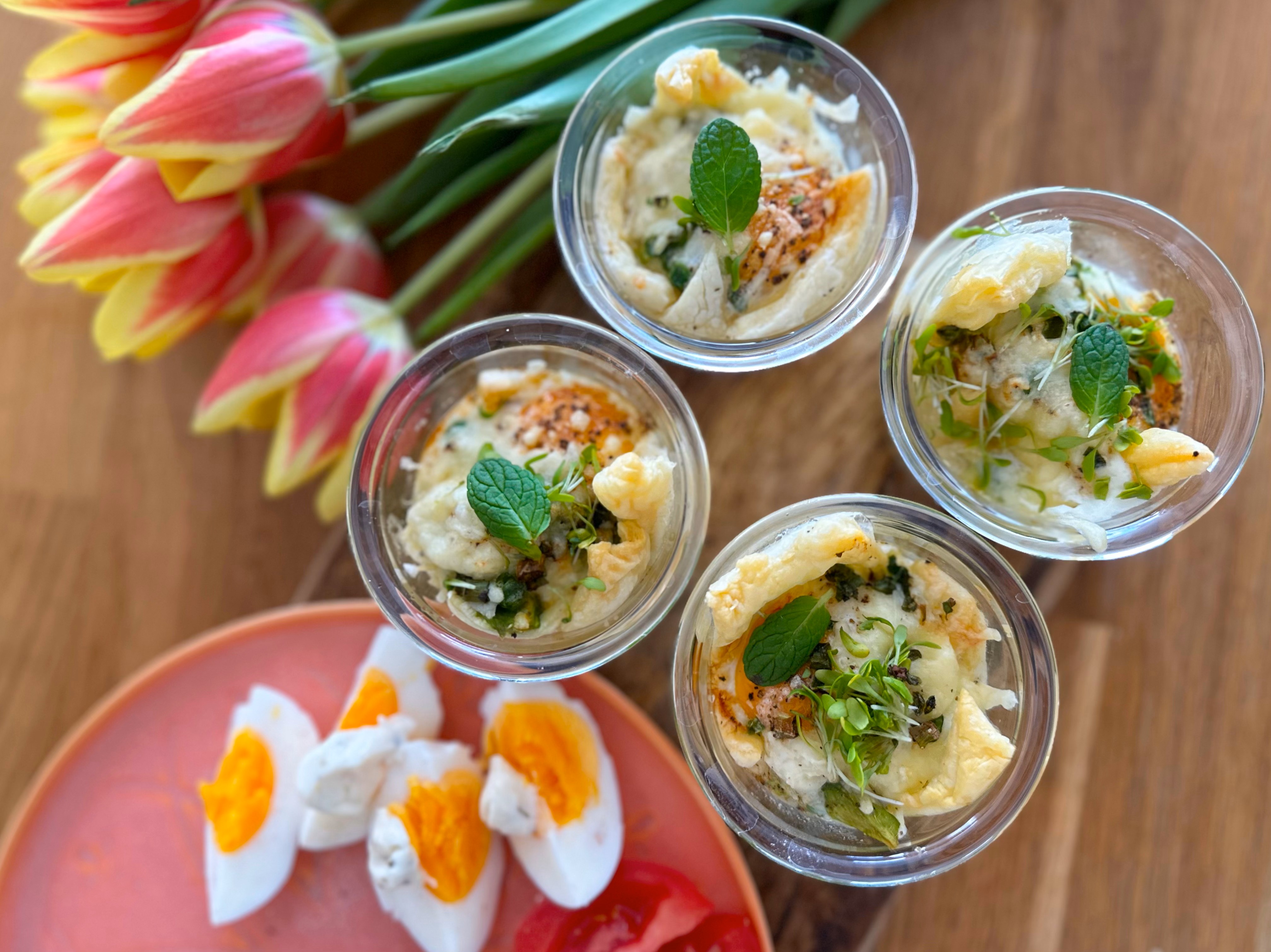 Połóż kanapki na kratce w koszu airfryera. Nałóż na każdą wycięte części kromki. Do każdego otworu wbij po jajku. Posyp pozostałą ilością sera cheedar oraz dodaj pomidorki koktajlowe.