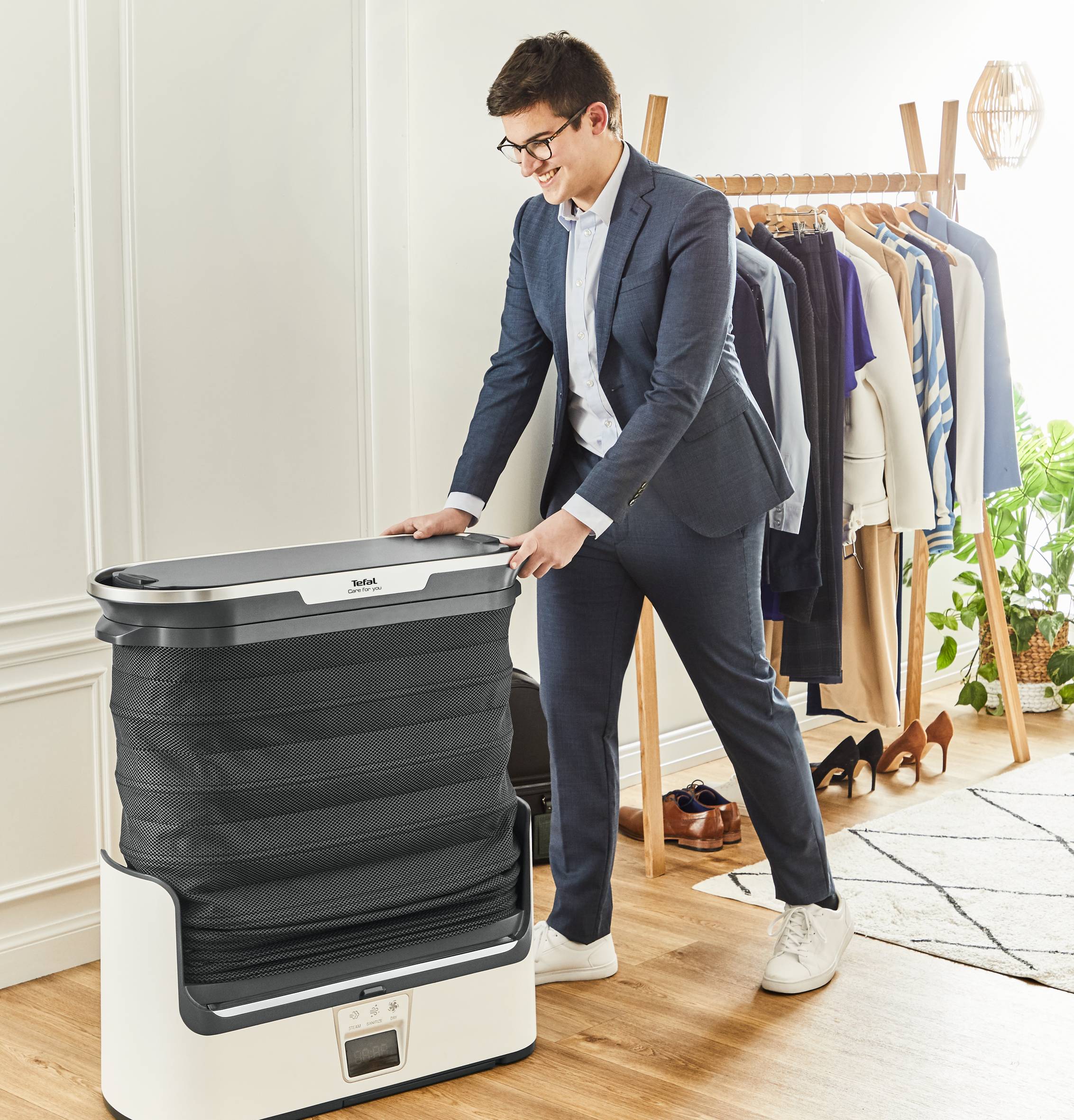 Odkryj w pełni automatyczną szafę parową Care For You marki Tefal, która dezynfekuje, pozbywa się zagnieceń i nieprzyjemnych zapachów z odzieży i tekstyliów —wszystko w jednym prostym procesie. Zrewolucjonizuj swoje poranne przygotowania do wyjścia z domu: umieść do 3 sztuk odzieży w urządzeniu, aby pozbyć się zagnieceń w zaledwie 10 minut lub pozostaw je na 30 minut, aby usunąć nawet bardziej uporczywe zagniecenia. 40-minutowy cykl dezynfekujący pozbywa się do 99,99% wirusów, bakterii i zarazków*, redukując jednocześnie nieprzyjemne zapachy, takie jak dym nikotynowy czy zapach smażonego jedzenia. Oszczędzaj czas i energię dzięki funkcji suszenia, bez ryzyka skurczenia lub przypalenia materiału - urządzenie nadaje się do wszystkich rodzajów tkanin, również delikatnych. Care For You posiada czytelny wyświetlacz oraz zdalny system sterowania, a jego pionowa konstrukcja zajmuje możliwie niewiele miejsca. Poznaj rewolucyjny sposób dbania o tkaniny! *zewnętrzny test laboratoryjny bawełnianej odzieży, tryb czyszczenia, 40 minut