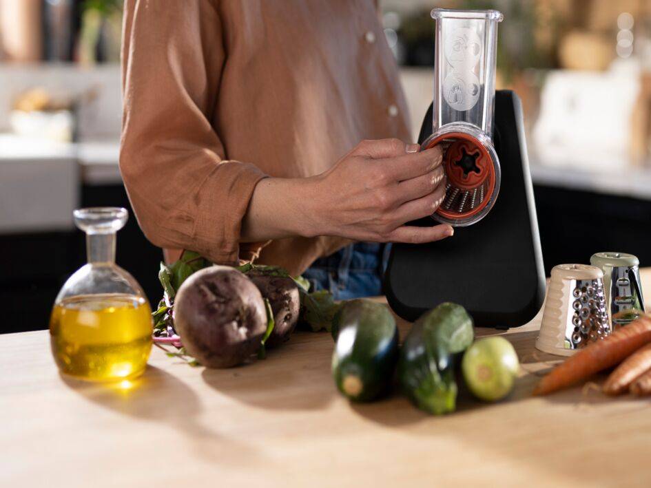 Z wielofunkcyjną szatkownicą Eco Respect przygotowanie składników jest prostsze niż myślisz! Od teraz za pomocą jednego urządzenia możesz kroić, trzeć i siekać (warzywa, owoce, sery, czekoladę) na wszystkie ulubione dania: sałatki, placki, przystawki i wiele innych. System kolorystyczny wymiennych końcówek sprawia, że korzystanie z urządzenia jest wyjątkowo proste: nasadkom nadano kolor intuicyjnie związany z ich funkcjami: zielony - końcówce do pokrojenia w plastry np. ogórka, żółty - nasadce do tarcia np. sera, czerwono/pomarańczowy - akcesorium do szatkowania np. marchewki. Dzięki szerokiemu otworowi nie musisz kroić warzyw na małe części - zmieszczą się nawet duże kawałki. Korzystanie z szatkownicy ułatwia możliwość mycia elementów w zmywarce oraz sprytny system przechowywania końcówek, dzięki któremu zaoszczędzisz miejsce w szafce. Szatkownica Eco Respect to produkt stworzony z myślą o naturze, kompaktowy i stylistycznie pasujący do każdej kuchni.