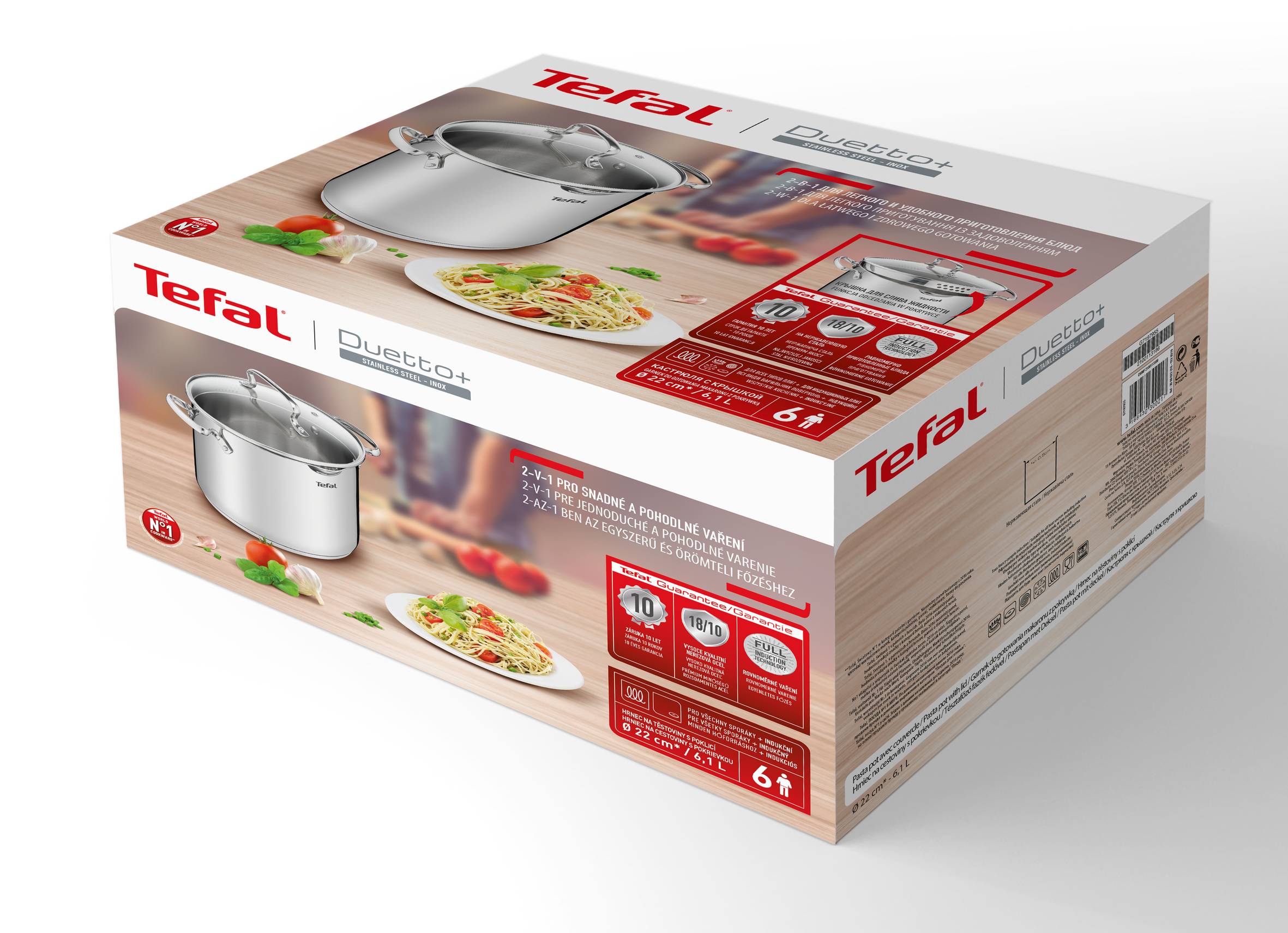 Seria garnków Tefal Duetto+ powstała z myślą o najbardziej wymagających użytkownikach naczyń kuchennych. Wykonane ze stali nierdzewnej produkty są niezwykle trwałe i nawet po latach prezentują się efektownie. Stal nierdzewna 18/10 objęta jest aż 10-letnią gwarancją. Wysoka jakość na korozję sprawia, że nawet po latach garnki Duetto+ nie stracą nic na swoim połysku, a przede wszystkim - funkcjonalności. Mądre rozwiązania i projekt garnków Duetto+ zwiększają komfort ich użytkowania. Wewnątrz znajduje się specjalna miarka, ułatwiająca dozowanie płynów. Specjalne profile boczne ułatwiają odcedzanie, a solidne nitowane uchwyty ze stali nierdzewnej sprawiają, że z garnków korzysta się zawsze pewnie i stabilnie. Seria garnków Tefal Duetto dostosowana jest do pracy na wszystkich rodzajach kuchenek - również płytach indukcyjnych.