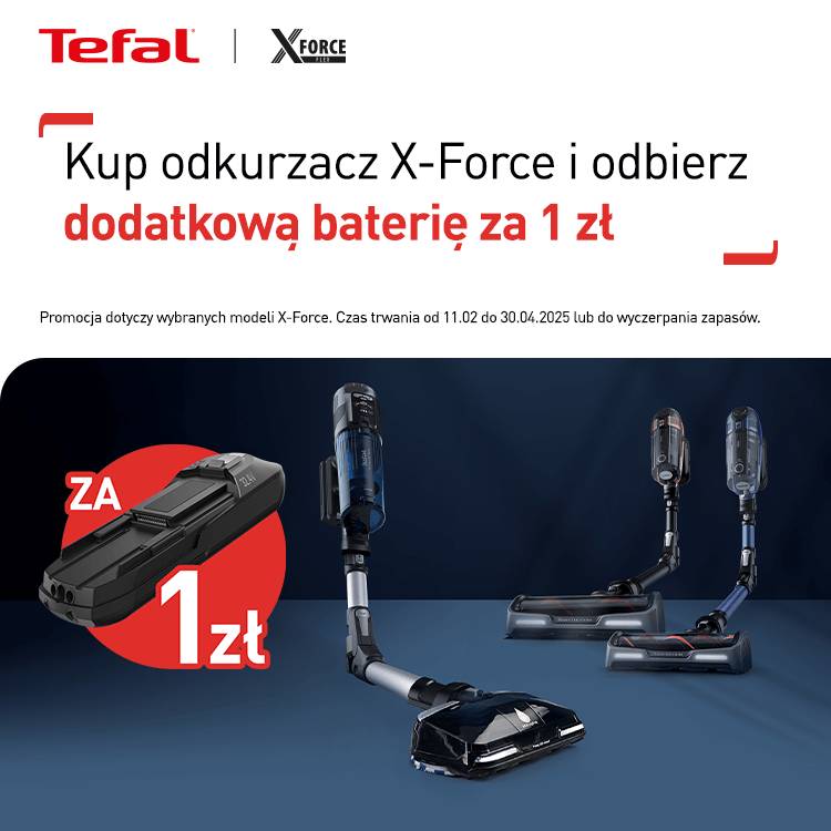 W dniach 11.02.2025 - 30.04.2025 kup za pośrednictwem oficjalnego sklepu Tefal.pl wybrany model odkurzacza bezprzewodowego Tefal X-Force Flex i odbierz przeznaczoną do niego dodatkową baterię za 1zł.