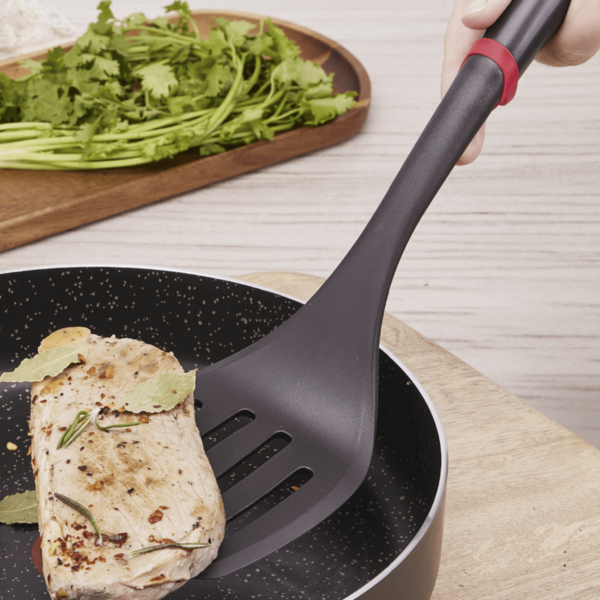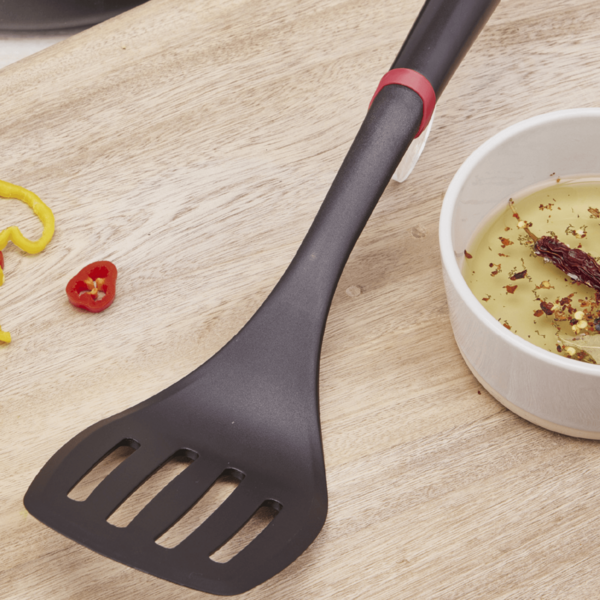 Niezawodne narzędzie o solidnej konstrukcji – wykonana z materiałów wzmocnionych 15 proc. włóknem szklanym, zapewnia wytrzymałość i odporność na temperatury do 230 °C, co sprawia, że dobrze radzi sobie przy delikatnych potrawach jak omlety i placuszki. Wygodny silikonowy pierścień zapobiega wpadaniu łopatki do garnka i chroni uchwyt przed gorącem, a możliwość mycia w zmywarce oznacza wygodę i łatwość utrzymania czystości. To praktyczne i trwałe uzupełnienie każdej kuchennej kolekcji.