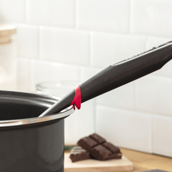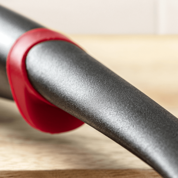 - Bezpieczeństwo: Silikonowy pierścień zapobiega wpadnięciu szpatułki do garnka oraz chroni uchwyt przed rozgrzanymi brzegami patelni